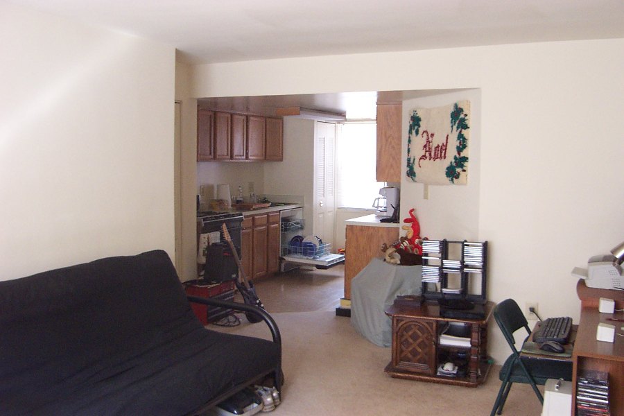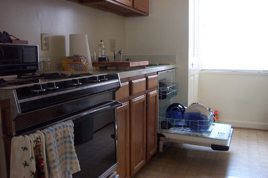 The place is pretty basic. It's old too....located in North Old Alexandria, VA as a matter of fact. The sockets don't even have grounding holes. It includes a washer and dryer, dishwasher, and miniblinds. And a refrigerator and gas stove too. The neighborhood is pretty nice. There's people keeping in shape everywhere...running up and down the streets at all hours of the day. I think I'm the youngest person in the area though. If it's not a 5 year old kid, then it's a 28-45 year old adult. Back to my apartment. It's one bedroom (about 600 sq. ft.), one bathroom. Two closets (neither very big). A nice sized living room and a small kitchen with about 20 cabinets with shelves just short enough to keep me from putting cereal boxes in them. The bedroom is pretty nice sized too. I pay $699 a month, plus electric and gas. They pay for water and trash.
