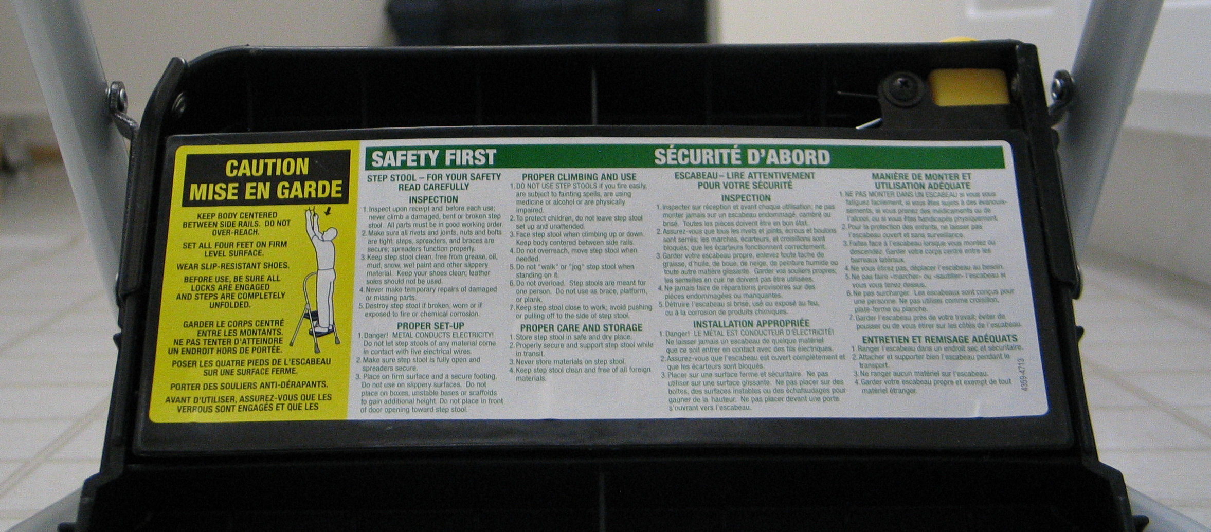 Littered all over this stepladder are warnings seemingly meant for people not yet old enough to read. This ladder conducts electricity. Metal does that? Really? I guess I won't place this on any live electric wires then. Not for Commercial Use. What business is it of yours what I use this ladder for? It's a stepladder. And finally... ![]() (Click the image to get a bigger one.) Yeah, just in case you didn't understand how to stand on a stepladder, here is how you do it. You wouldn't want to get befuddled, and plummet all 12 inches to the earth below. When I first started this post, it was about federal mandates and how we're being increasingly encroached upon by nannies all around us (like the airbag warnings in car visors, that are impossible to remove without destroying the visor). But then a fresher realization came to mind... Lawsuits. If these warnings weren't on the ladder, then someone might have cause to sue the company that made it (China), which is a little less stupid, but more sad. Since complaining about stupid lawsuits is nothing new, I'll stop here. I ended up getting my windshield replaced. Everywhere I called it was going to be $600 or more. Windshield City, though, did it for $195. The molding isn't set perfectly, but I don't think that's necessarily a bad thing. It's much better than the molding on my Prelude after going to Safelite to get the windshield replaced, where the guy who worked on it, who couldn't even speak English, actually destroyed the molding clips and taped it down, so that when I removed the tape I had molding flopping around. And on top of that, the car leaked every time it rained. So far, it hasn't rained, but I'm hoping the Subaru doesn't have the same problem. I should also mention that the guys working there were pretty cool, and had no problems if you wanted to stand near them while you worked, and would even BS with you if you stood there long enough. I saw Bruno this last weekend. I don't recommend it to anyone. I liked Borat, but Bruno lacked the improvisational humor, and had too much of the "shock" that I could have done without in Borat.-13JUL2009 A Chick-Fil-A opened up near my apartment yesterday. I don't know why I get excited when I see a Chick-Fil-A... It's not like their food is especially good. All it is, is a chicken patty (not chunked and formed like most other chicken patties), a couple slices of pickle, and bread. I think there might be cocaine ingredients in there, somewhere... Well anyway, they also do breakfast - and guess what they have on their menu for $2.35? Breakfast burritos! So I tried them this morning, one sausage and one chicken. The chicken one was better, but neither were anything to scream about, unfortunately. Egg, peppers, meat, and a packet of salsa. No potatoes, no cheese (or, at least not enough that I could taste it). Good quality, good flavor, but not great. I still long for a breakfast burrito of the same quality that you could get at Bubba's in Jackson Hole, WY. I got a new computer chair. The last one had all the cushion of a pillow case, and was getting torn up. I ordered a new windshield last week. Still haven't gotten the call from the place I ordered from... The longer it takes them to contact me, the more reluctant I am to trust them to install it. Other than that, there is nothing new going on. Sara Palin announced her resignation from her governorship today. Almost every media outlet I've looked at, has tried to make it look like she's doing it to angle herself to run for president in 2012. While I seriously have problems with her wealth redistributionist policies, I still think she's received a very unfair shake from the media and her opposition. Her family, especially (I remember, when Obama came out, the GOP were trying to go after his wife. After McCain won the primary, he did what the Obama supporters wanted, and that is to leave the candidate's family alone, which is perfectly reasonable. However, when Palin came out, it was an all-out assault on her family, which was justified because she "brought them into the spotlight with her"... Funny, I don't seem to remember her daughter ever speaking for her like Michelle did for Barrack). This move, I think, is because she's tired of being in the spotlight and has decided to end her political career. I know I'm going against the grain with that, but I think it's a better explanation than the DNC chairman's assessment that it is simply a "continuing pattern of bizzare behavior". Tomorrow is the fourth of July, also known as Independence Day. At the same time there's a proposal sitting on the desks of our congressmembers that would turn you, or your employer into a criminal for not purchasing health care. - 03JUL2009