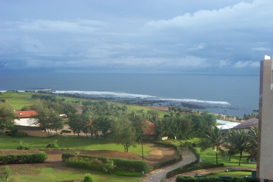 The hotel we stayed at was heavily contrasted against the rest of the area... Looking out of the right side of the bus window at the neighborhood (and trash and hard working construction) the hotel popped out as sort of an oasis which instilled immediate awe. Luscious palm trees, a huge fountain.. nicely paved driveway, and most importantly, it was big. Easily the largest building in the area.