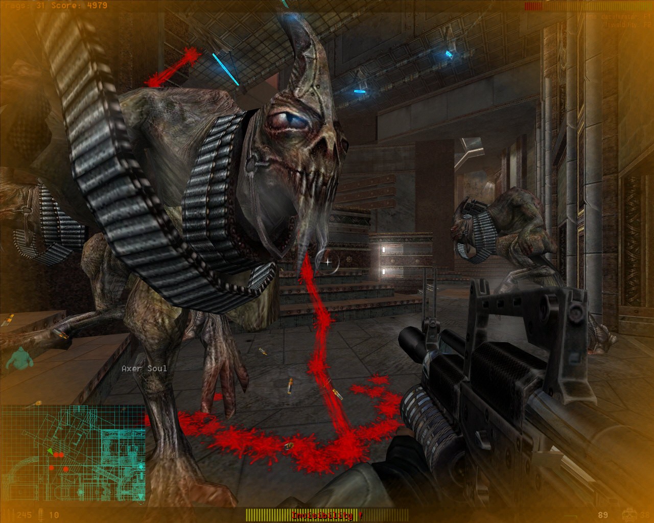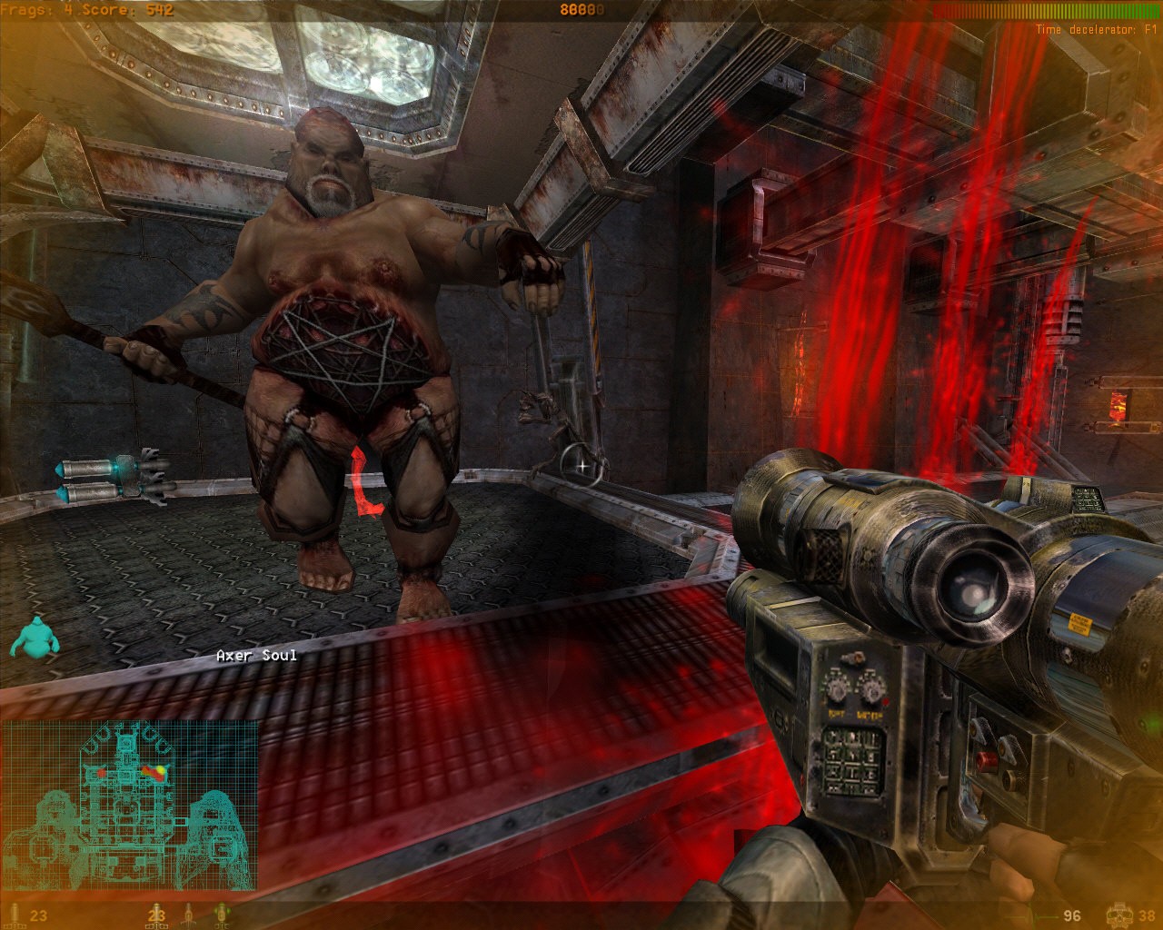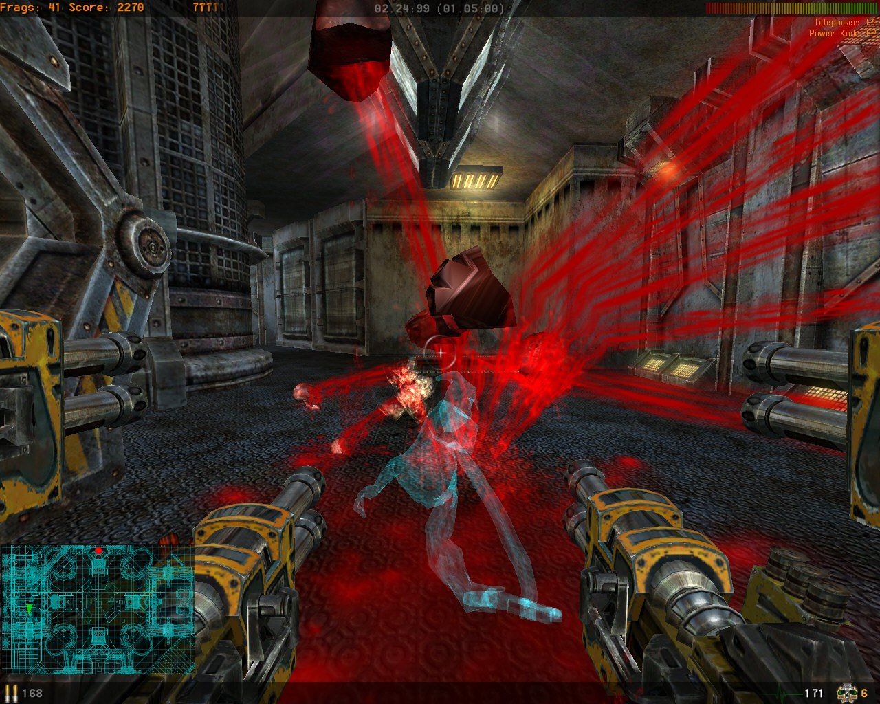 The weapons you get are pretty varied... but you don't really get a 'choice' to use the most effective one because of how the game is constructed. This fact makes it seem like the game is more of a tech demo where the developers simply played around with a few ideas and just never removed them from the game. There's two different rocket launchers, one of which launches several different types of rockets... all kinds of machine guns, gatling-style shotguns.... Every single one of the weapons have a distinct difference that sets it apart from others, but all kill with the same effectiveness. They all have an "impact" to them that makes my heart leap that no other game I've played has been able to reproduce. It may have something to do with the nearly overdriven effect volume or the way the screen shakes with each round being blasted into the nearest chest. When you play as a mutant and you're holding four huge shotguns surrounding your screen, there's nothing more exhilerating than walking up to a small enemy and decimating it an a shower of blood and flesh chunks... or even better finishing off a larger enemy this way.