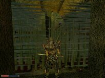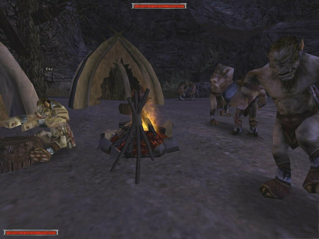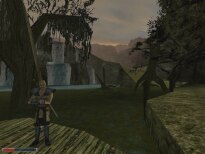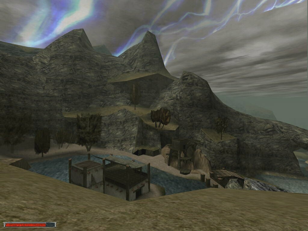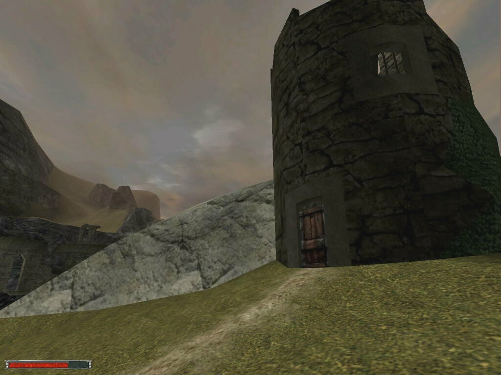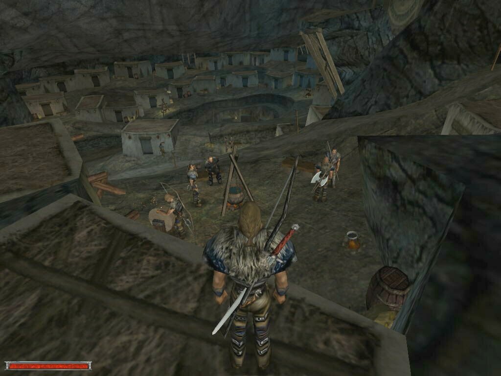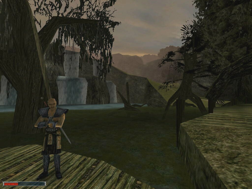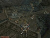 You start out with the opening movie of some guy telling you to give a letter to the head fire mage, and then you get pushed into the shield to deliver it. Apparently you are going to prison, and to do that task would mean freedom. Maybe. The rest of the game has little to do with that. I had most of my fun running around and exploring the massive world contained in the game. The character runs at a good pace, and to go from one end of the colony to the other (the swamp camp to the old camp mines) it took me about 10 minutes. To circle the entire thing...I would imagine 35-40 minutes. And there's still tons of stuff in between. I was mostly in disbelief on how much work had been put into the game. The main thing that surprised me is that I NEVER got stuck inside an object. I could run between crevices, drop down into trees, jump inbetween rocks...etc, etc. I always managed to get out of it. This surprises me so much because of how the world itself is designed. It seems that the developers did it in stages. One of which was.. "It would be cool if I put this here" phase. There's places where if you turn, you can see textures underneath each other... as if they thought the original one was out of place, and instead of deleting it and making a new one, they just covered it up. Complete on-the-fly development. Another thing I find amazing is that there's no pattern to any part of the world. Fences run along hills at different angles, with many different textures. Roads wind this way and that, no bridge is alike. Except two. (The Orc camp and the Orc Temple). Towers have different designs, floorplans. Castle walls have breaks and moss, and little add-ons all over the place. Etc. Etc. In better words, I love the design. I'm glad they took liberties with it, and somehow made it work better than most other 'professionally' developed games.