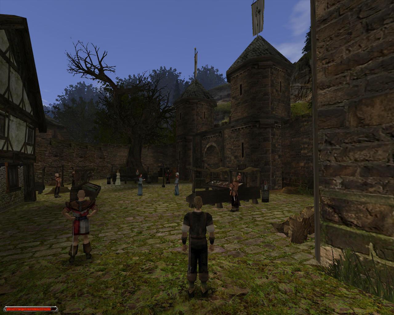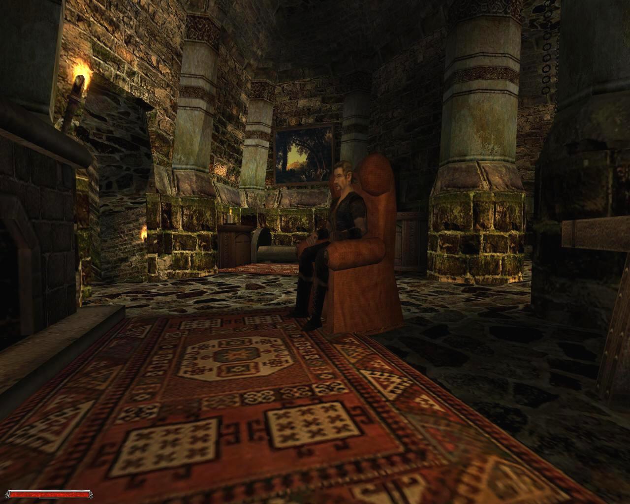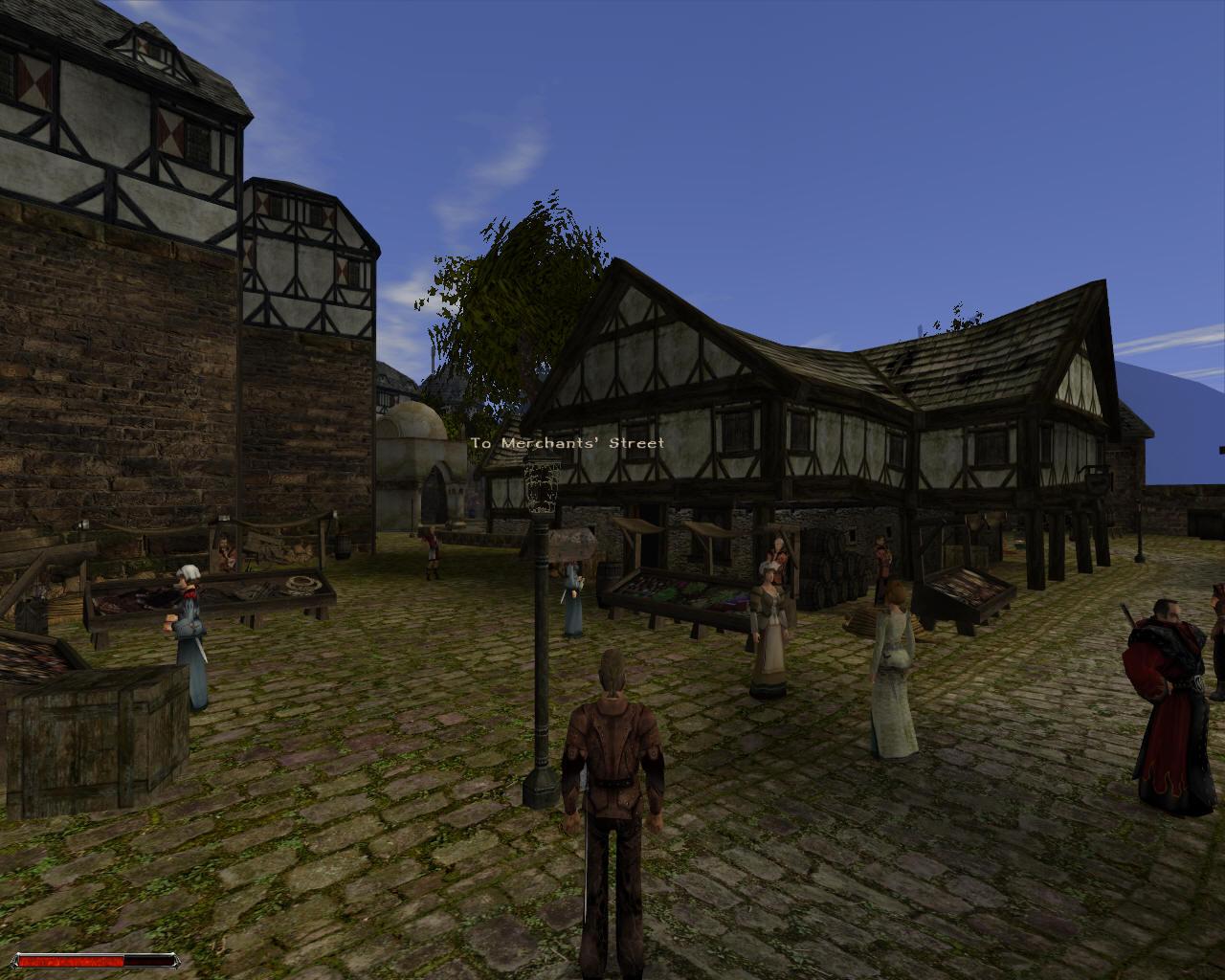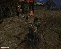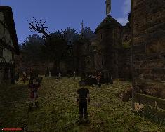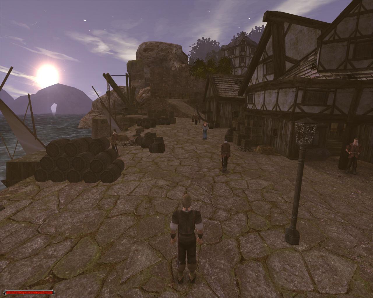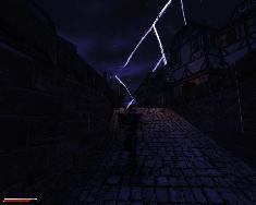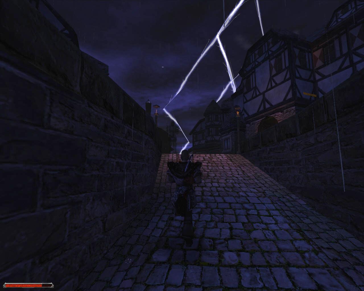 The day/night schedule is still intact, as well as the weather system, complete with rain (sometimes accompanies by lightning), snow, and even cloud shadows. People will do different tasks depending on what time of the day it is. Merchants will close up shop and go to the tavern for a drink, and then go to bed (and sometimes get very annoyed when you wake them, especially if it's with a sword or an axe). They will work and sell goods in the rain just the same as if it were beautiful weather, though.
