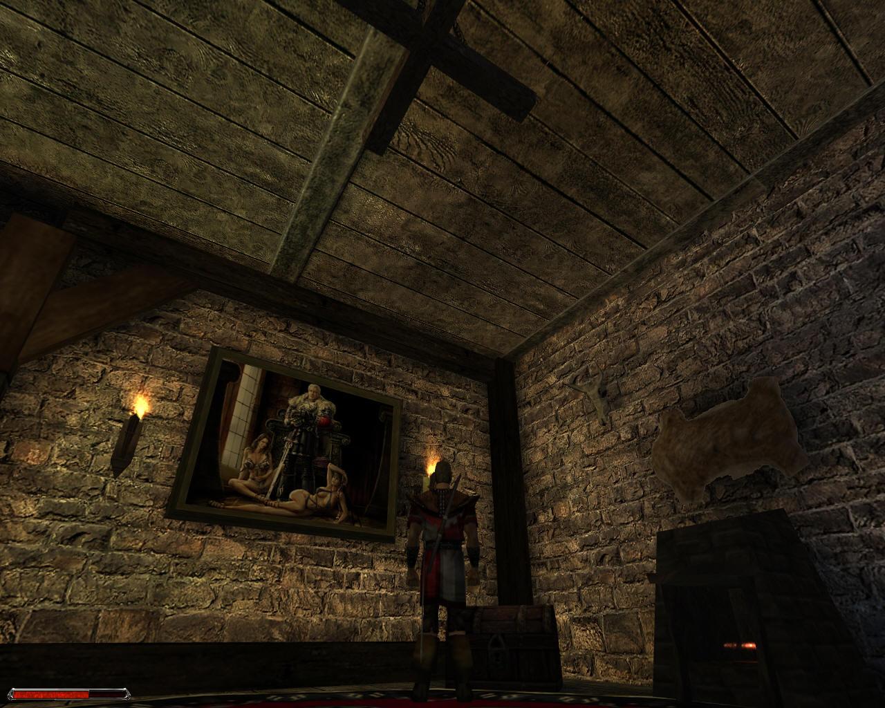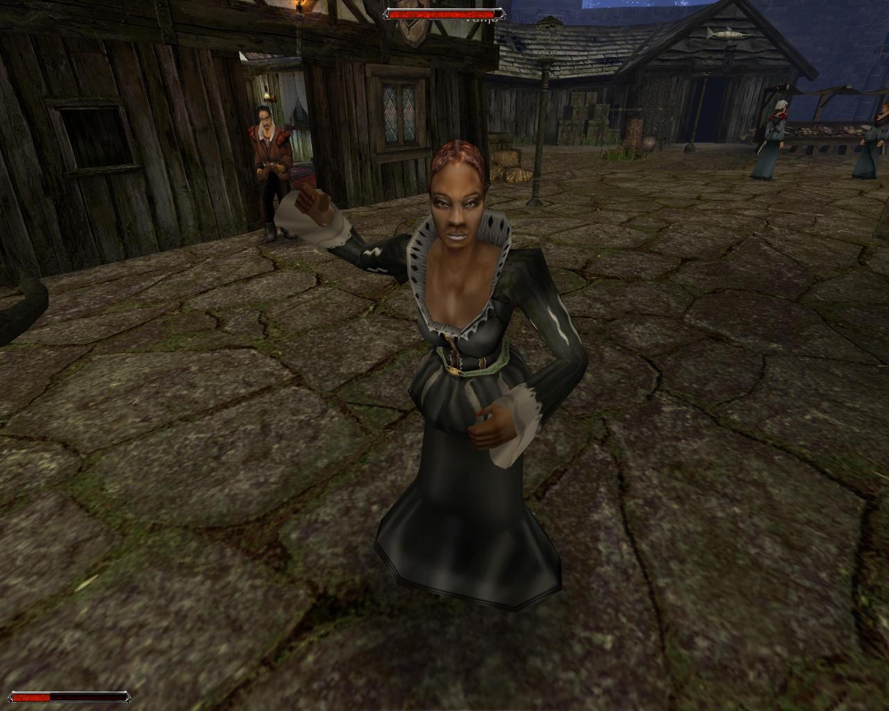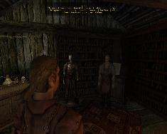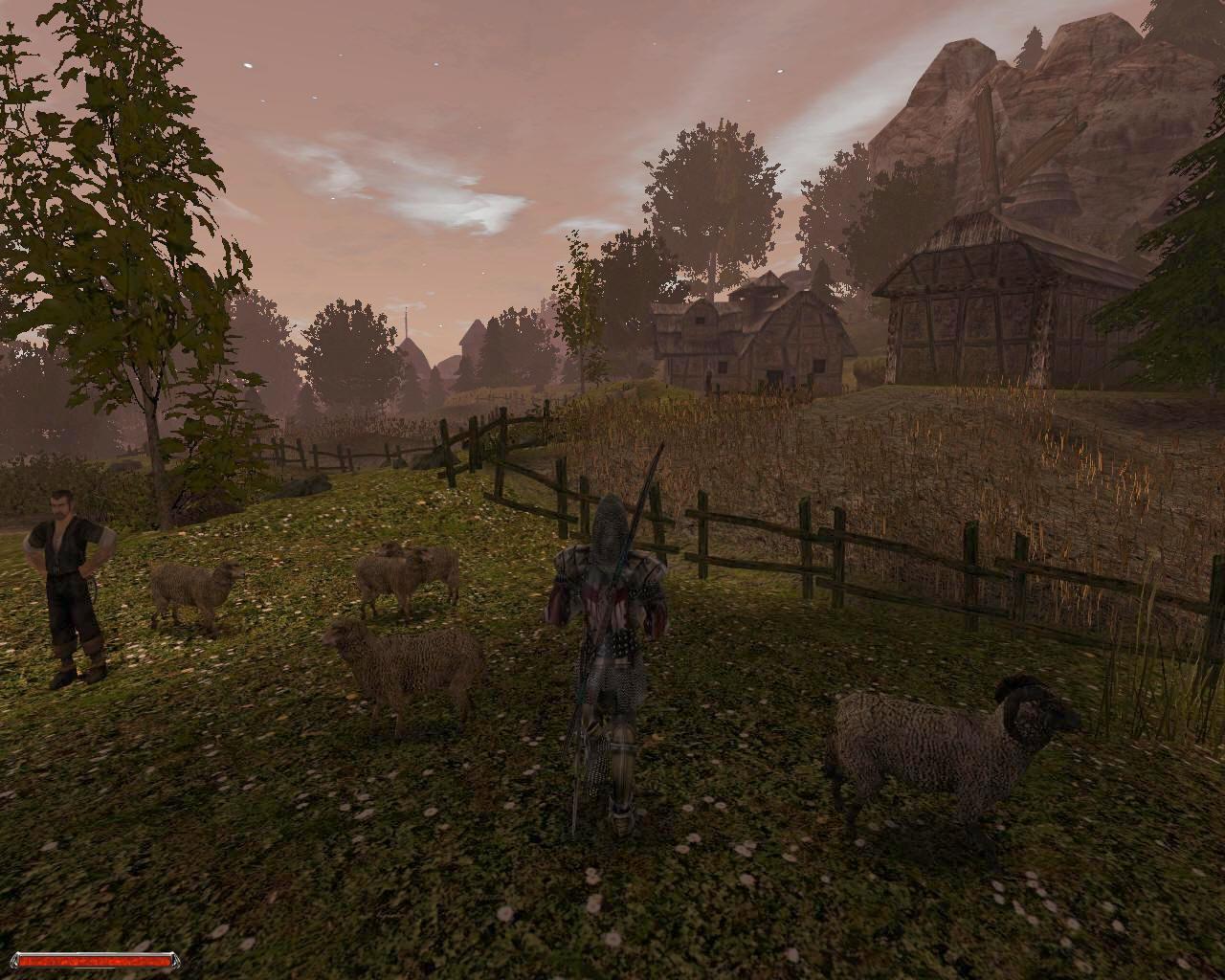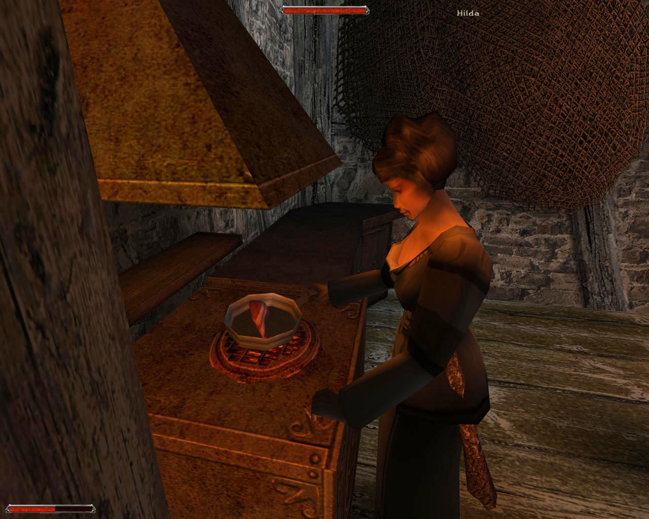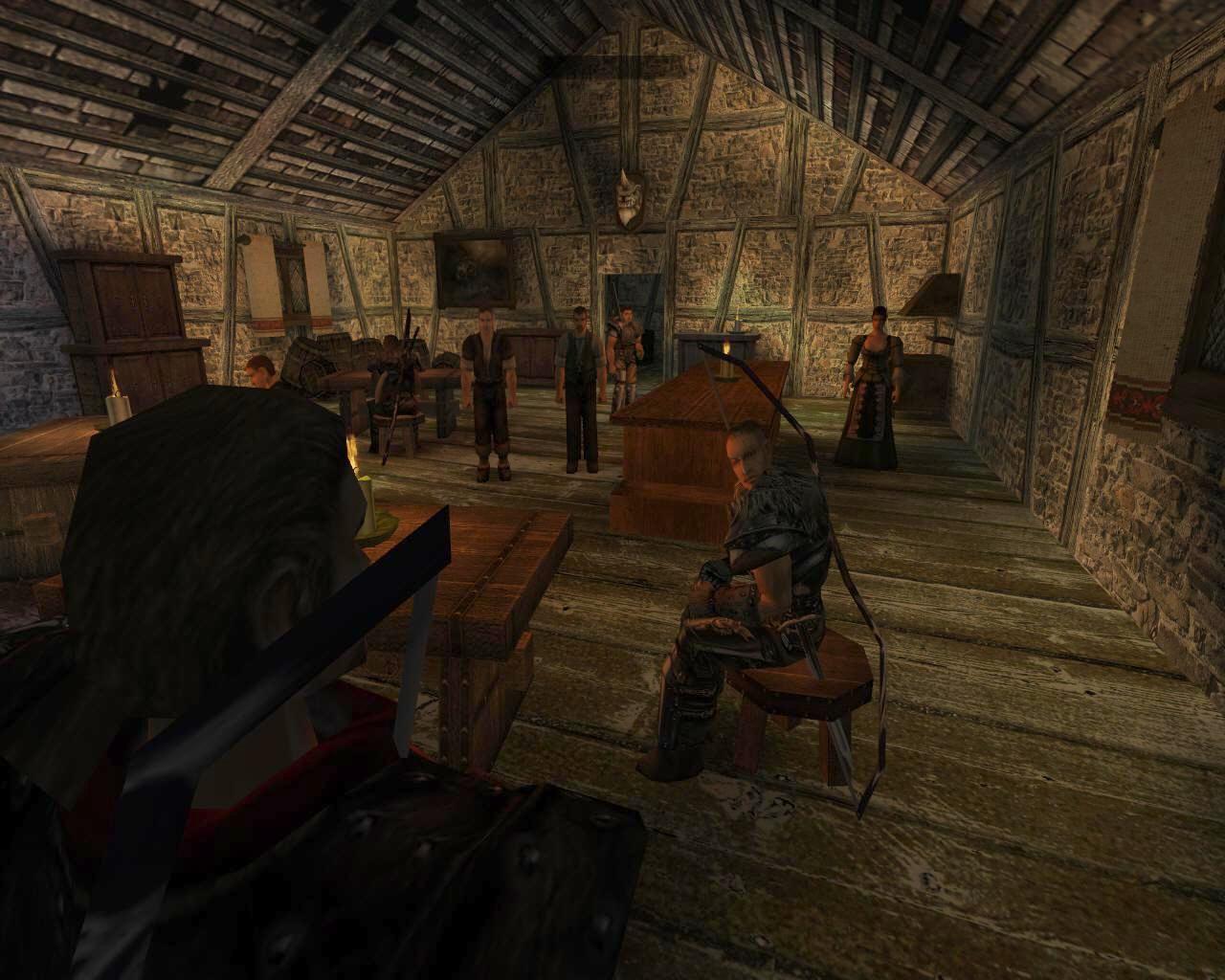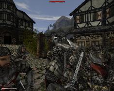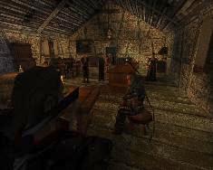 The day/night schedule is still intact, as well as the weather system, complete with rain (sometimes accompanies by lightning), snow, and even cloud shadows. People will do different tasks depending on what time of the day it is. Merchants will close up shop and go to the tavern for a drink, and then go to bed (and sometimes get very annoyed when you wake them, especially if it's with a sword or an axe). They will work and sell goods in the rain just the same as if it were beautiful weather, though.