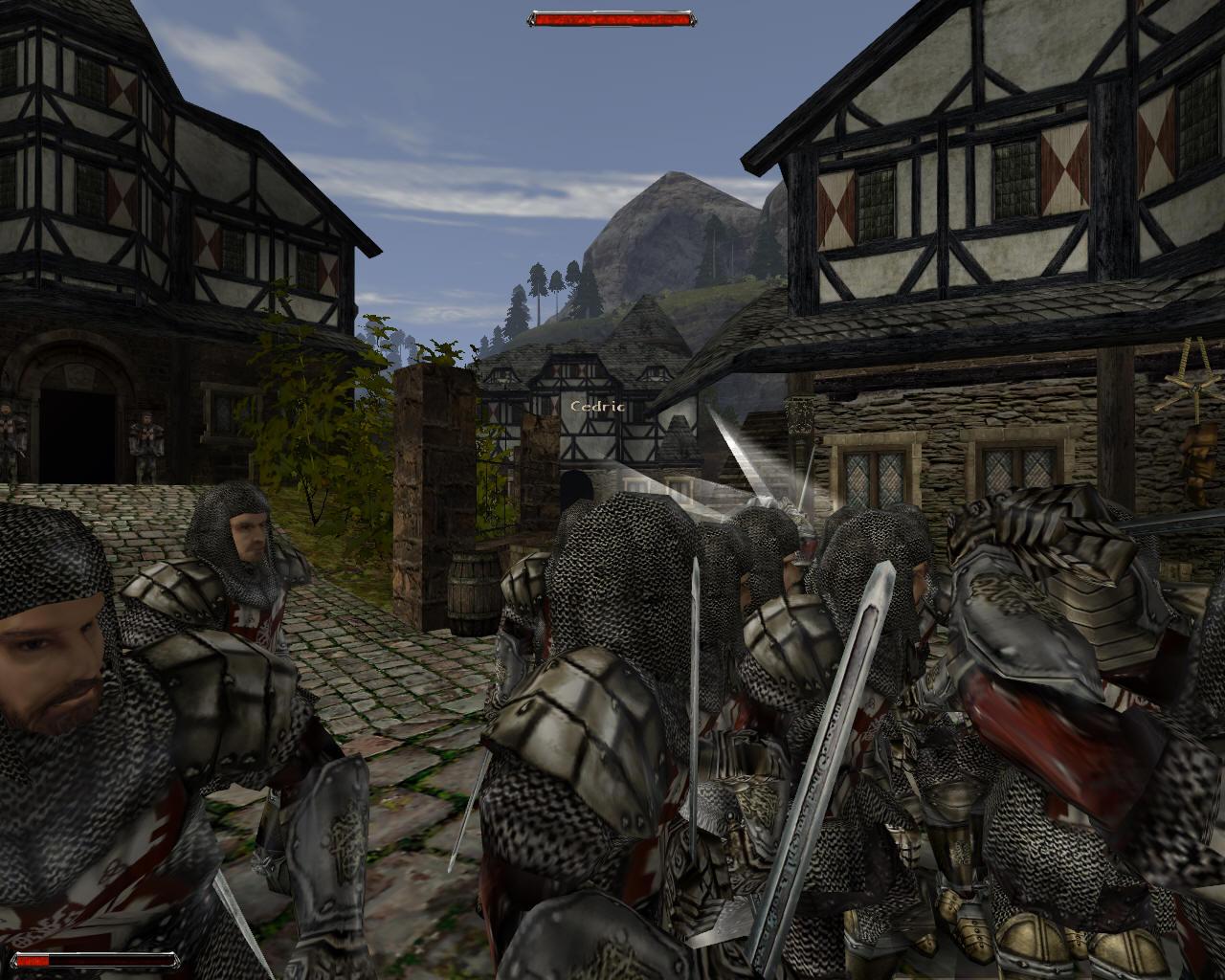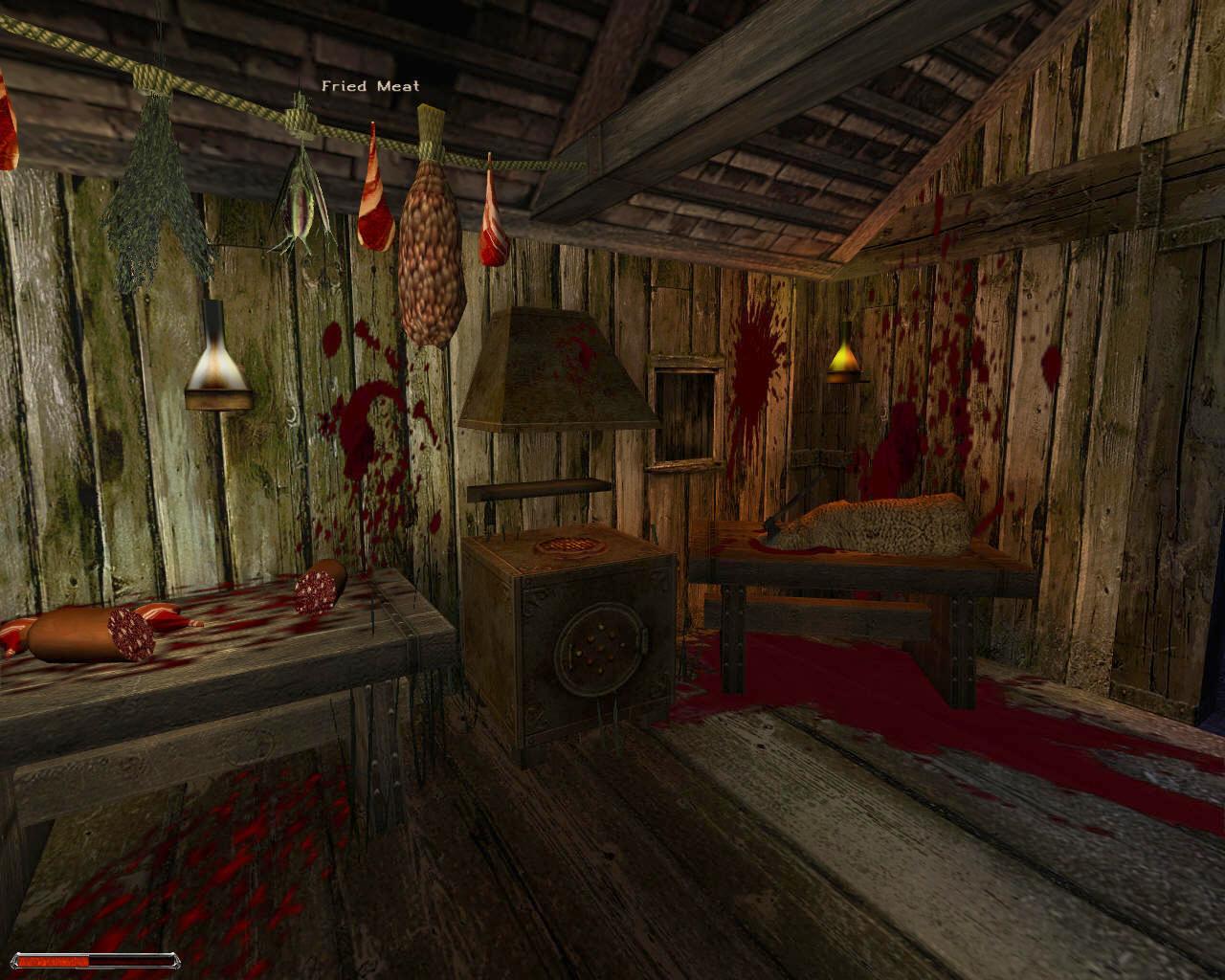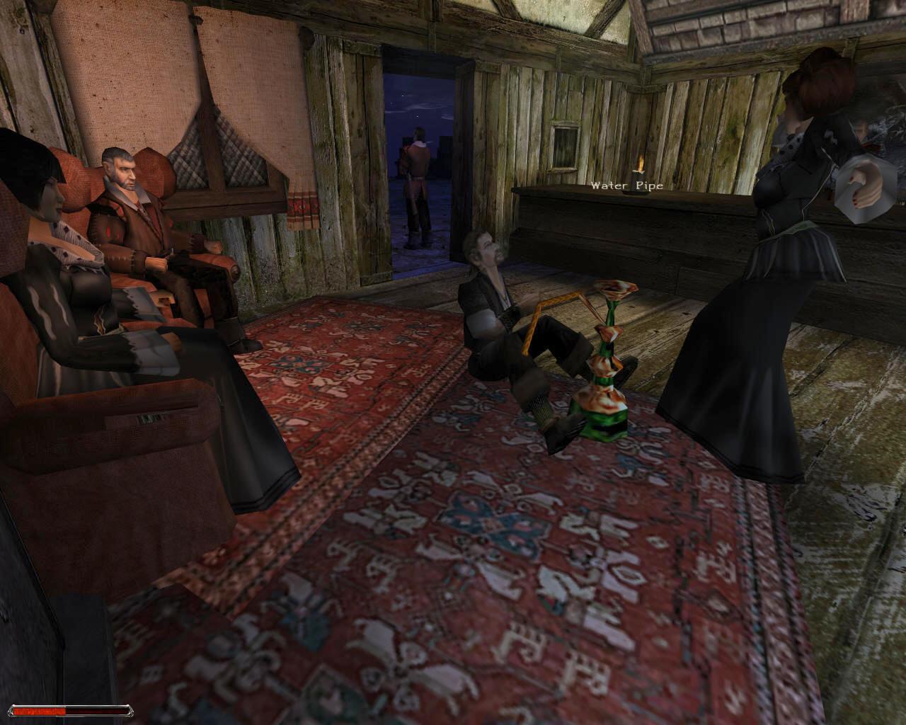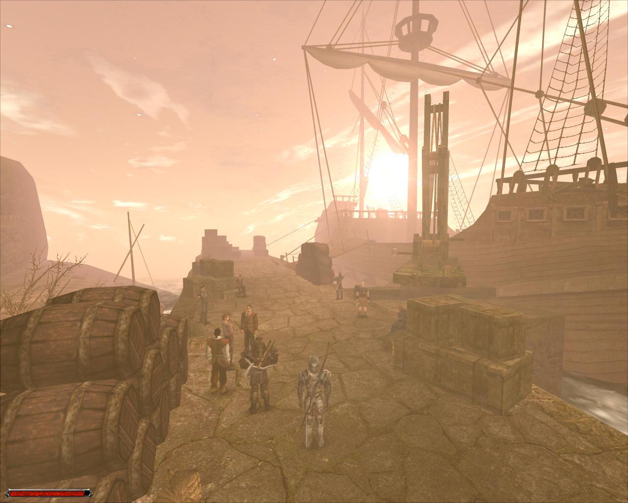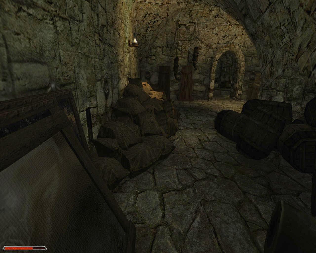 The day/night schedule is still intact, as well as the weather system, complete with rain (sometimes accompanies by lightning), snow, and even cloud shadows. People will do different tasks depending on what time of the day it is. Merchants will close up shop and go to the tavern for a drink, and then go to bed (and sometimes get very annoyed when you wake them, especially if it's with a sword or an axe). They will work and sell goods in the rain just the same as if it were beautiful weather, though.