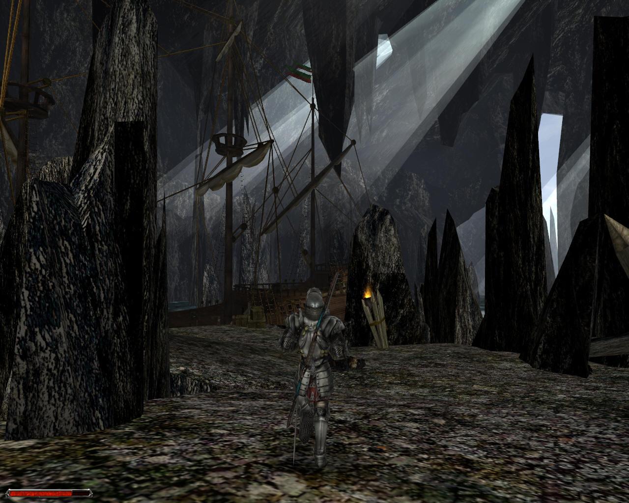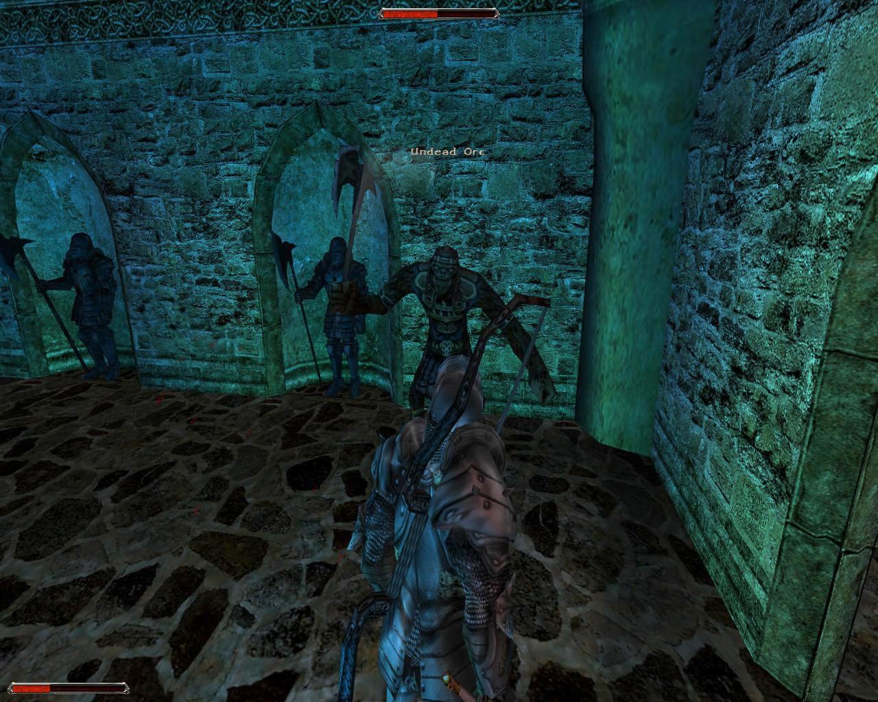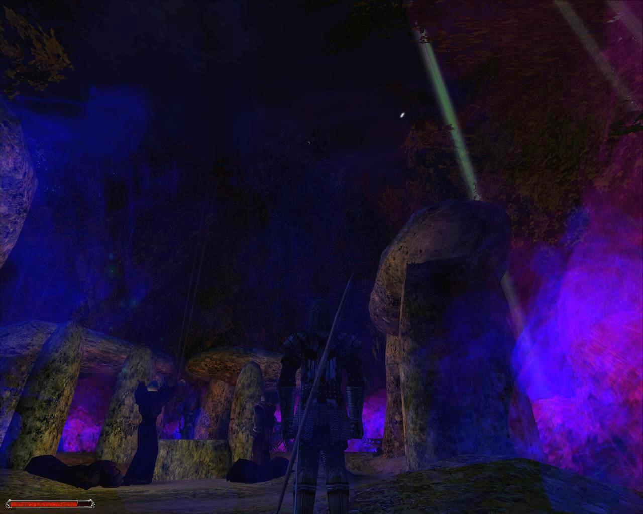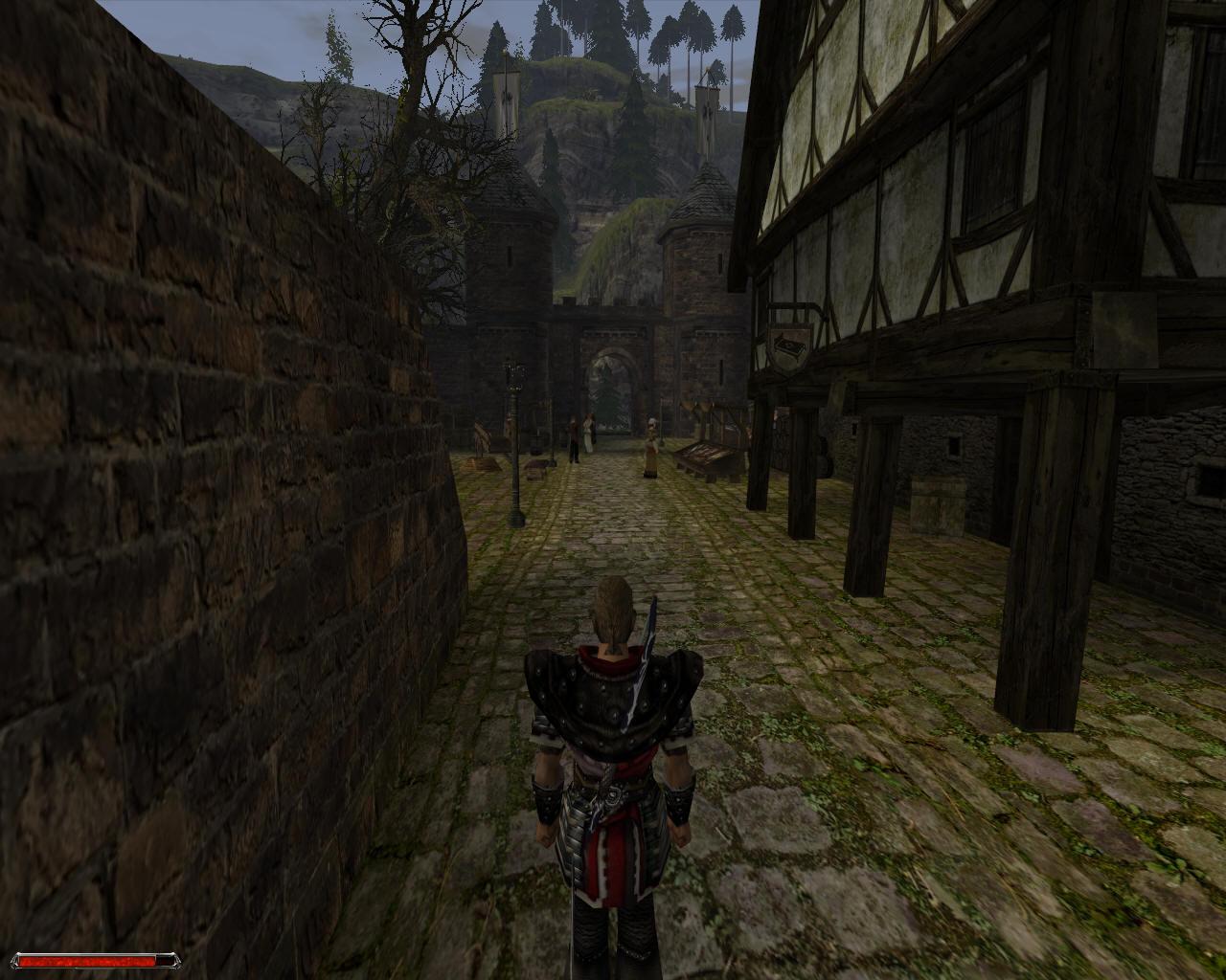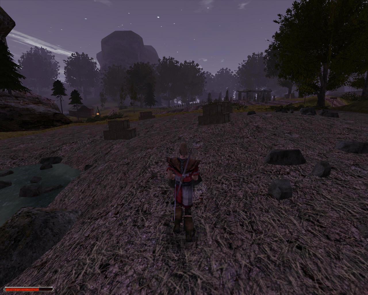One thing that kind of disappoints me about the world design, is there are so many ways to go places you weren't meant to that you get stuck between rocks or sliding up a mountainside (yes.. sliding UP). I'll go through all these antics trying to jump to the top of a pile of boulders to get to the top of a cliff that I can only barely reach with the hopes of finding some special potion or scroll or book or character at the top, but instead I find holes into infinity, and ugly stretched textures that I wasn't meant to see. In the Old World I made it to where the Orc camp was supposed to be (the place across from the broken bridge), but found a mountainside that led up to nowhere (where a temple entrance used to be). Also, I found no secret caves or tunnels by swimming underwater (though I did read about one secret cave that can be found in the Old World somewhere).