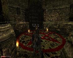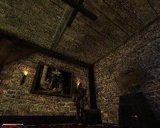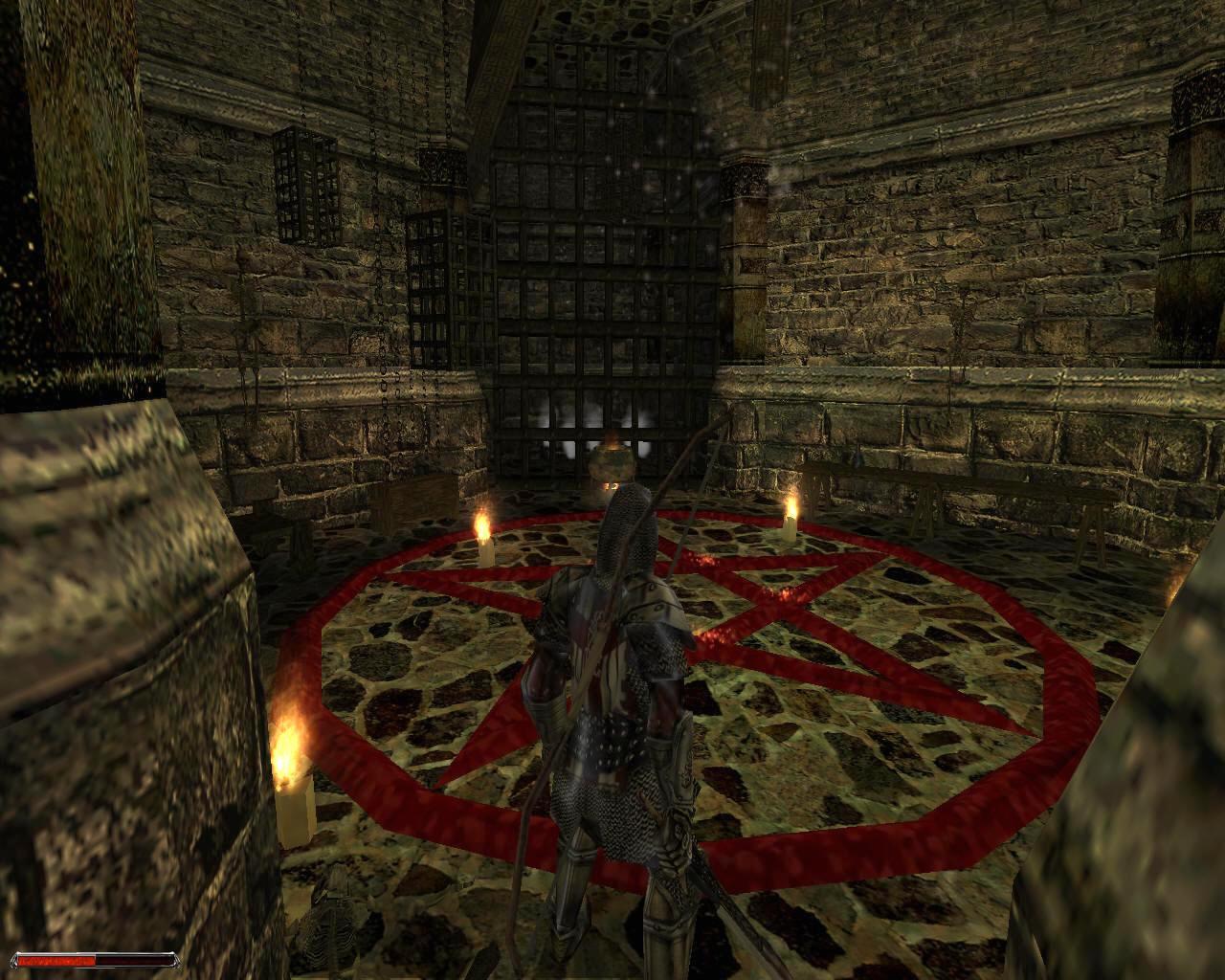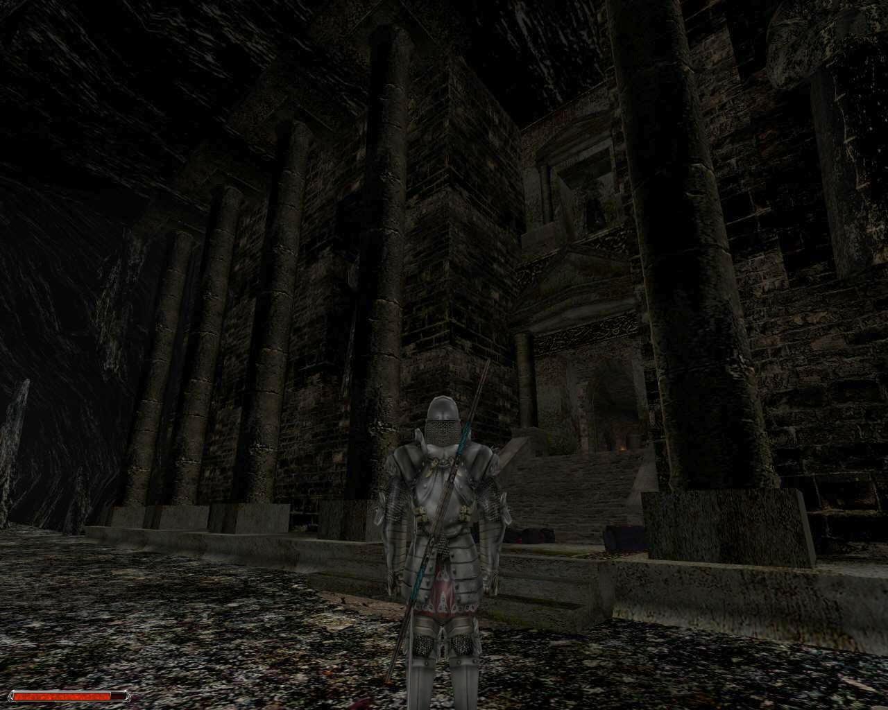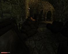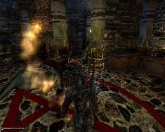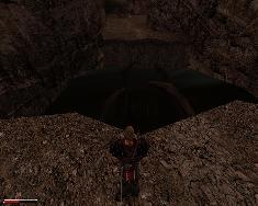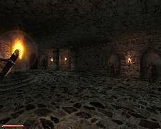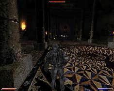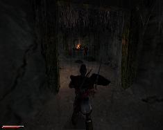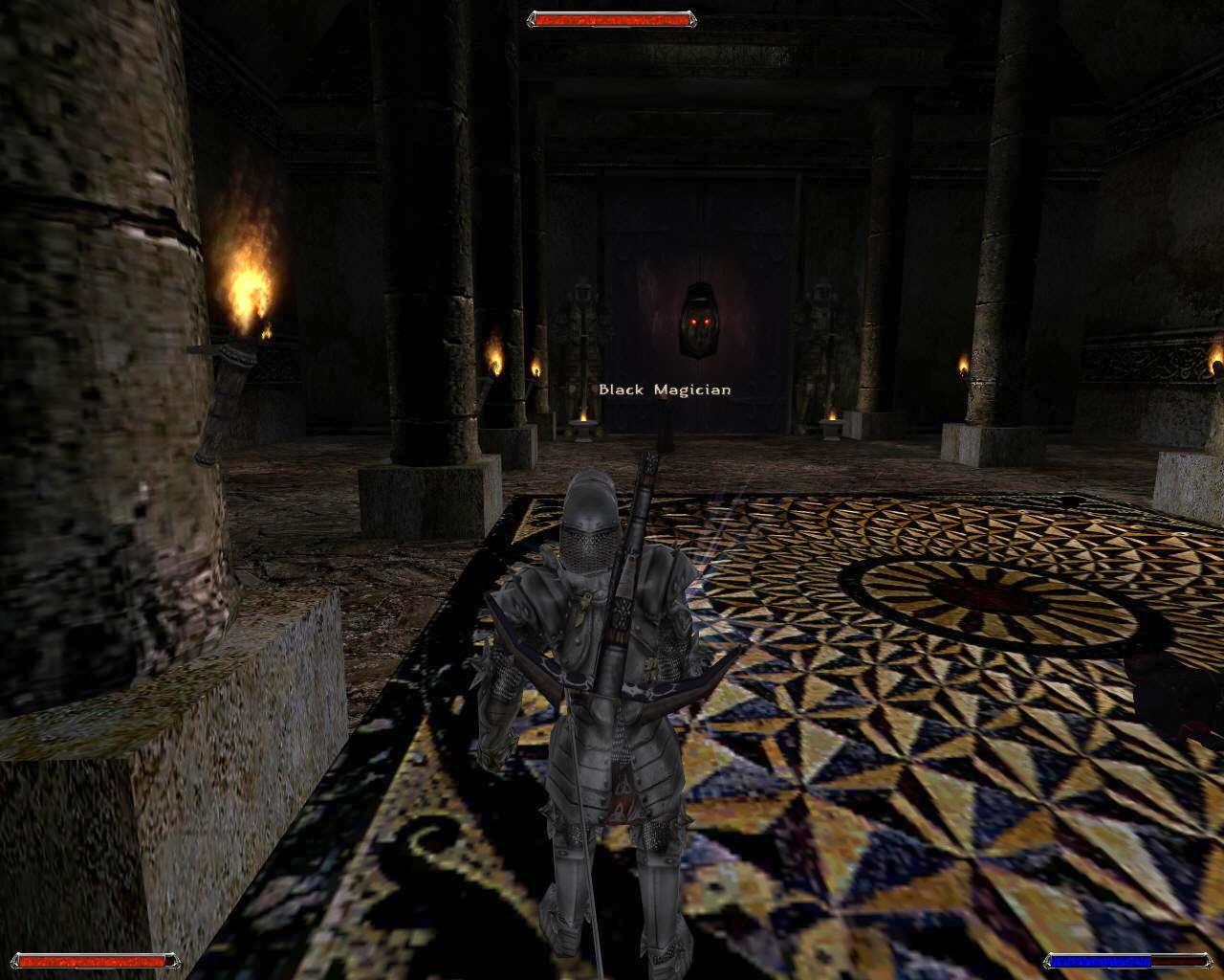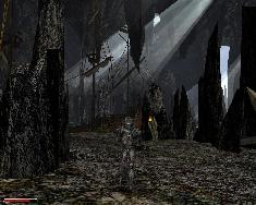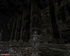 Talk about building up my excitement for nothing... Man this place was ugly. Lacked all of the pizazz of the first two worlds. The cave itself looked a mixture of two 8 color textures, one mostly gray and the other mostly black, spread across hundreds of angles and points and stretched almost to the point where you thought the texture would snap (but no, those are really stretchy buggers). There is a sort of crypt or dungeon or something inside the cave, that was somewhat well designed. But it lacked serious inspiration. What I said about there being no cut and paste leveldesign before.. well I lied. You see it here. Four rooms and tunnels are exactly the same, but forgivable because it makes the design symmetric in association to a certain puzzle you have to figure out to get through a door. Anyway, there's a room where you find a bunch of seekers and a Black Magician. This large room had tons of potential to be beautiful with it's intricate floor tiling and the pillars that bordered the floor, but instead came across bland and poorly designed because it did not fit well at all with the cave textures. It seems that the Gothic team were rushed during this phase in the development, because it sorely lacks anything challenging or interesting.