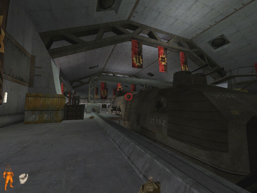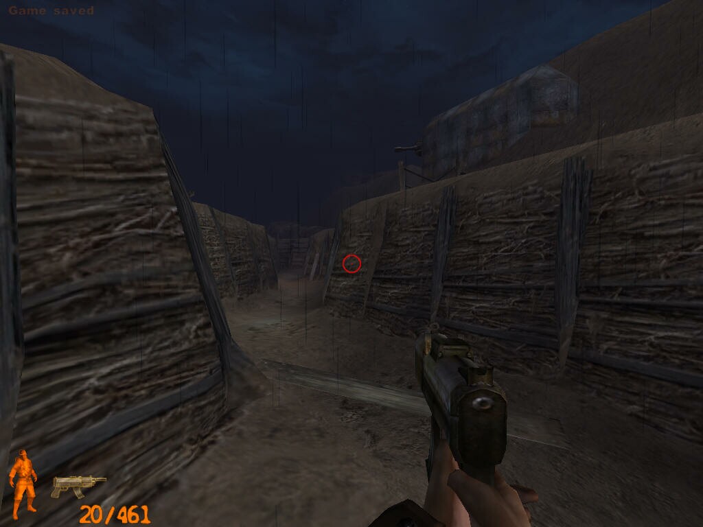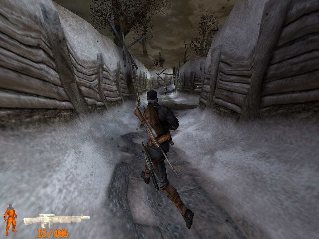 The basic story is, World War I never ended. Somehow 50 years have passed and it is still being waged. Your mission is to assasinate the great Baron (blah-blah) who is crazy hungry for territory. You must infiltrate your way through (blah-blah) many levels to get to him. The levels didn't make much sense to me... I didn't know why I was in half of them, or what they were supposed to be. For instance, there's this Train... It's armored and it has a huge mass of weaponry at every angle. It has helicopter support, and lots of enemies outside, inside, and around it. It's supposedly indestructible. Well... If we really wanted to stop it, we'd de-rail it, right? The rails weren't indestructible I'm sure... But instead you play through a level where you end up on top of it (start next level) and then you're moving along avoiding sniper fire, on top of the train speeding along at about 100 Mph. You get in, and you have to find some sort of box that the Baron supposedly can't have. I don't remember ever getting that box... Only ending up in another train station avoiding guys running around with grenade launchers.