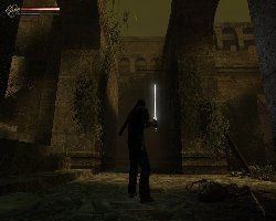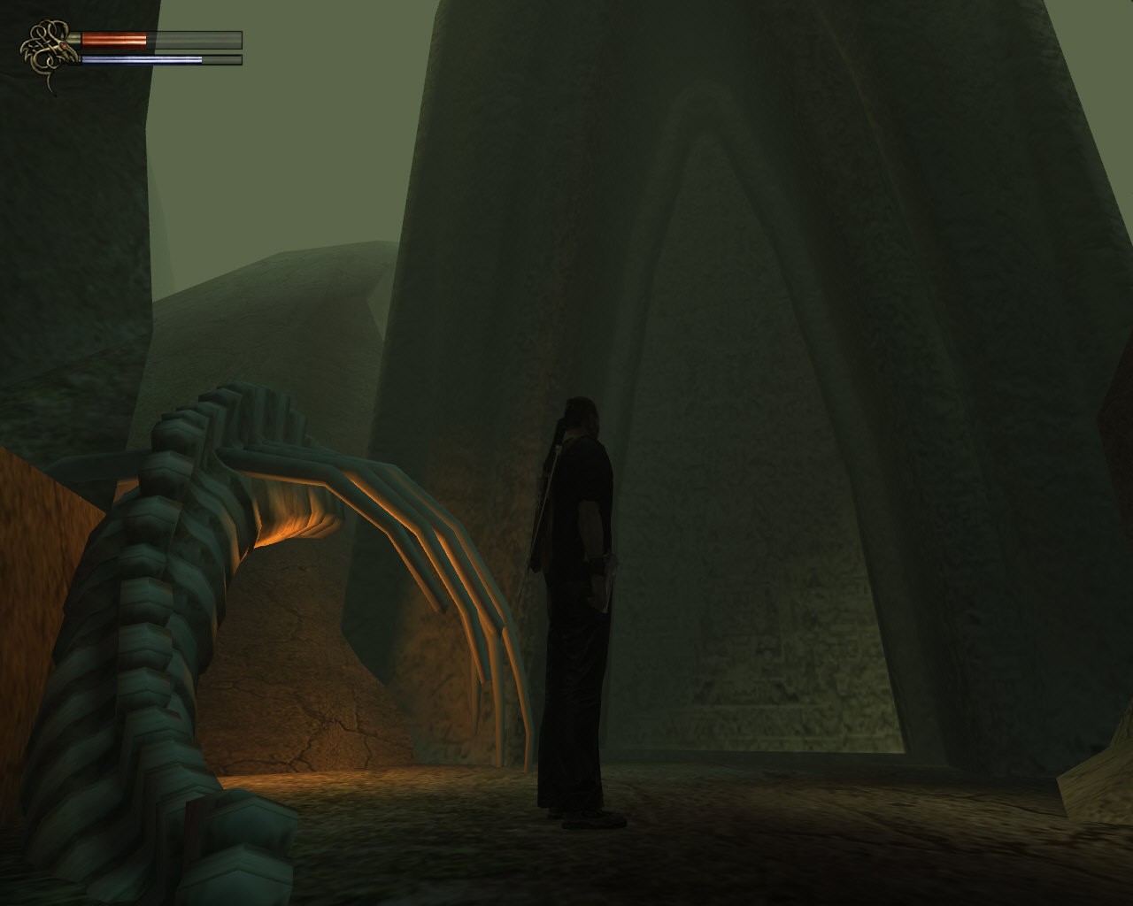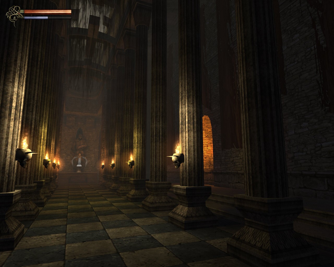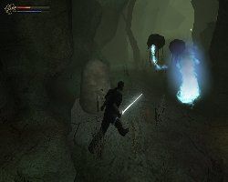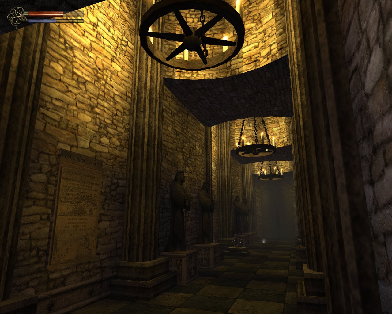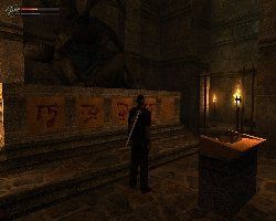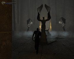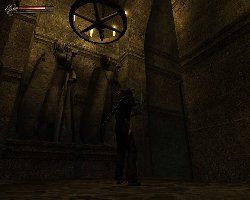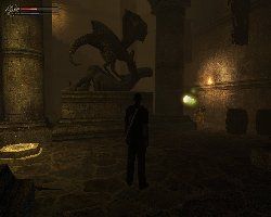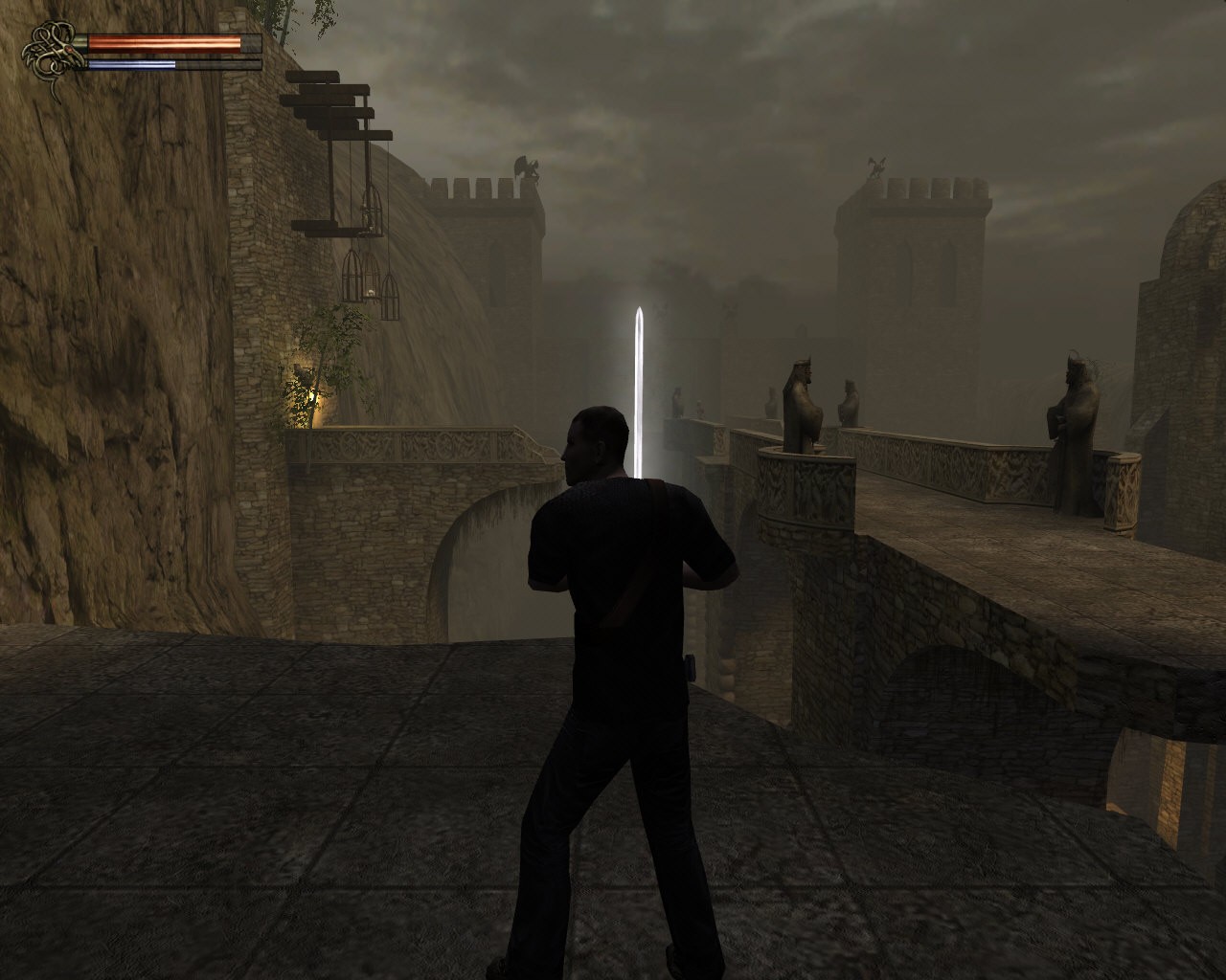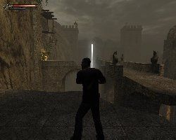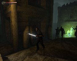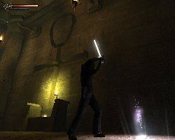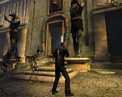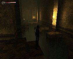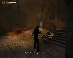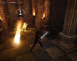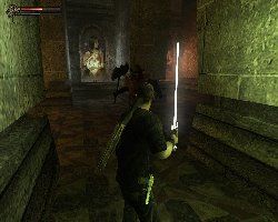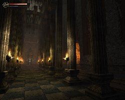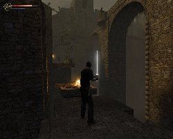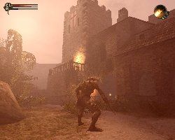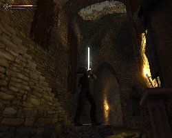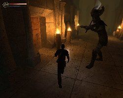 The graphics are the strongpoint of this game. Almost every texture is highly detailed and even bumpmapped. They are well placed around a level so that they blend perfectly. The lighting is also another strongpoint... Every torch or spell cast creates a glowing light that lights up the walls and objects around it. The environments are incredibly detailed.. from castles (the architecture of which was very similar to Blade, complete with evil churches), to medieval suburbs (houses made out of brick and wood.. cobblestone roads and bridges), to ancient temples and memorials and oasis' (hieroglyphics, crazy statues, salamanders.. :) ), to the shadowland where bones of humongous animals lay in strange parts of the map everywhere.. glowing heat coming from the ground (with which a motion blur effect is applied when you are near), and old scraggly trees reaching for the sky. There's also a swamp level, but it seemed rushed.. Far in the background you can see large boats that were immobilized, but if you tried to reach them you died instantly from an invisible wall that if touched kills you. The final level was neat too. Floating marble platforms lit by white torches surrounded by pitch black.. Reminded me of a section in the book Eye of the World. You have the option to use detailed shadows.. When the shadows are working, they usually look okay (though not nearly as realistic as Blade's). Unfortunately, 90% of the time there are no shadows being rendered.. even if you chose to render them always in the options screen.