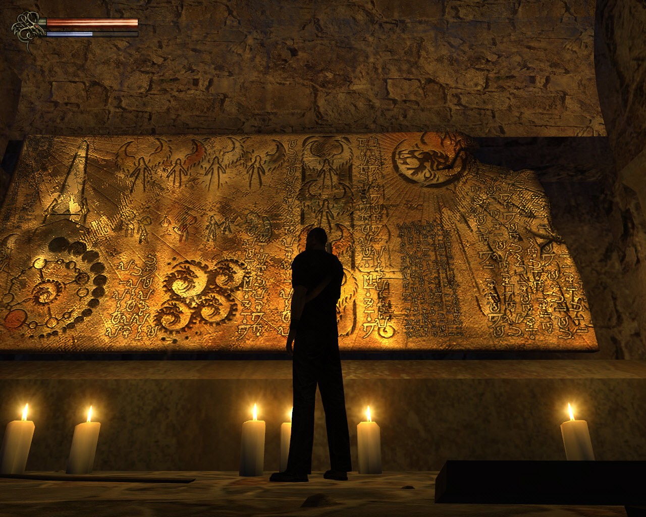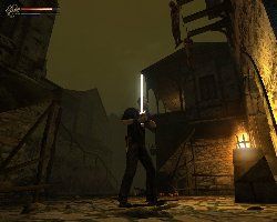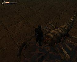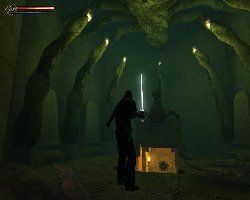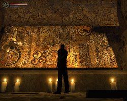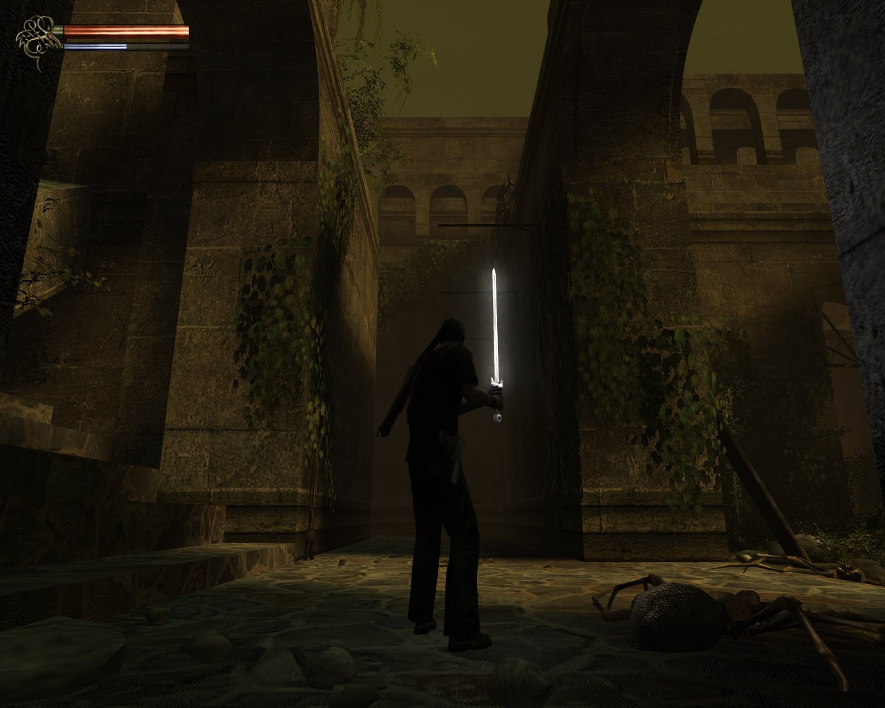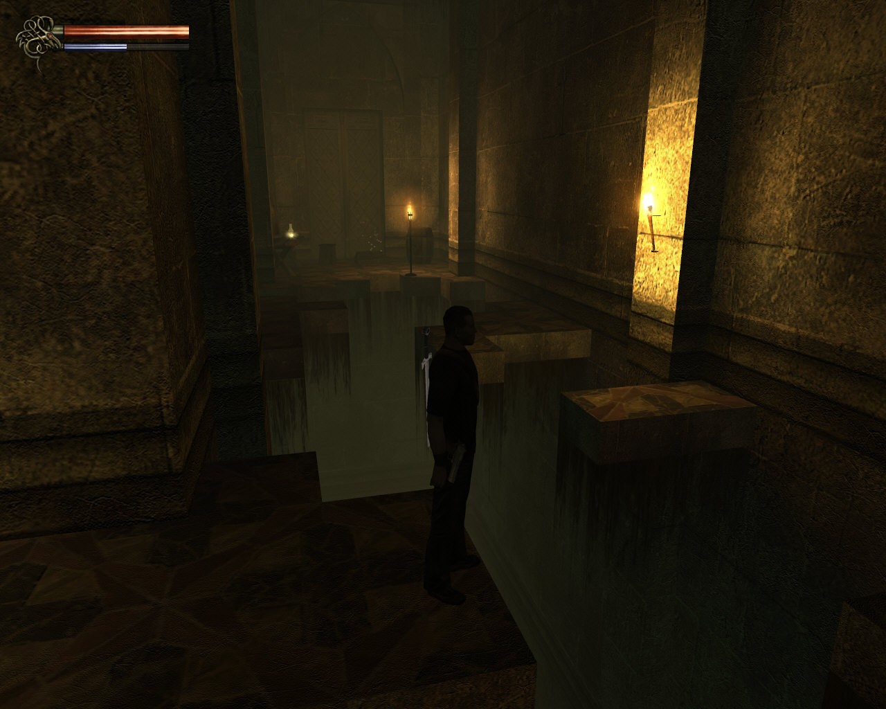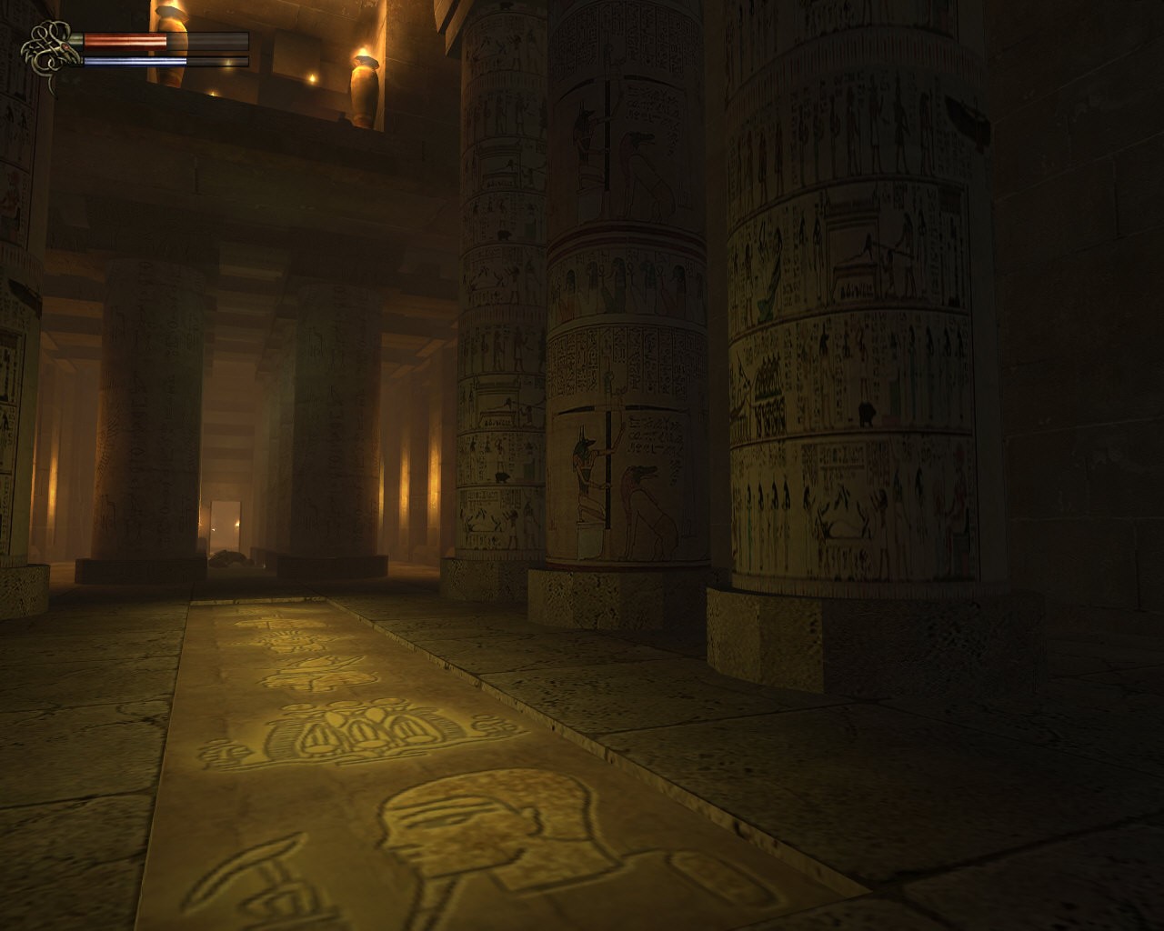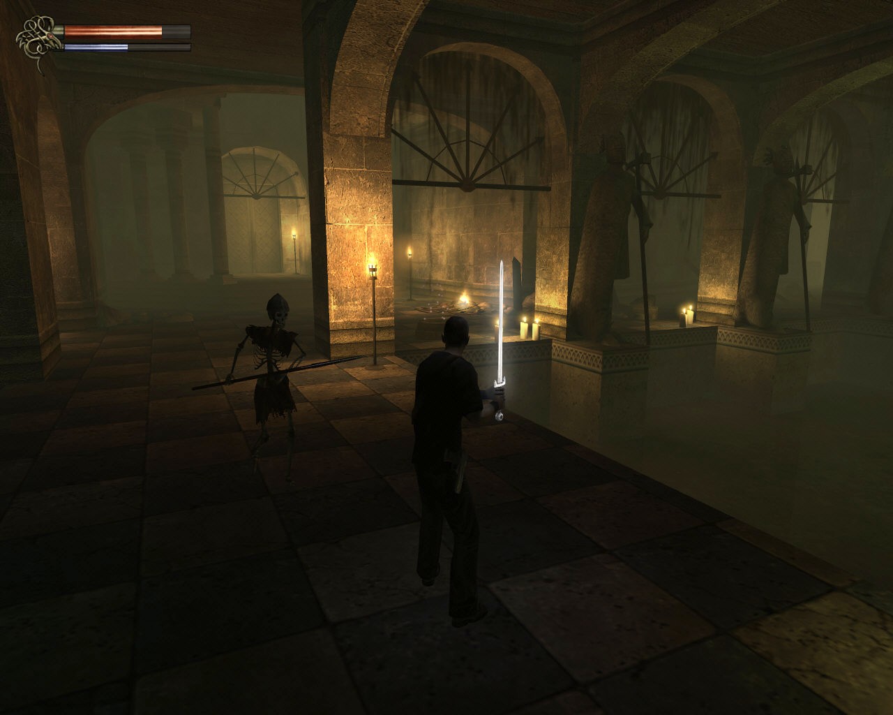 The graphics are the strongpoint of this game. Almost every texture is highly detailed and even bumpmapped. They are well placed around a level so that they blend perfectly. The lighting is also another strongpoint... Every torch or spell cast creates a glowing light that lights up the walls and objects around it. The environments are incredibly detailed.. from castles (the architecture of which was very similar to Blade, complete with evil churches), to medieval suburbs (houses made out of brick and wood.. cobblestone roads and bridges), to ancient temples and memorials and oasis' (hieroglyphics, crazy statues, salamanders.. :) ), to the shadowland where bones of humongous animals lay in strange parts of the map everywhere.. glowing heat coming from the ground (with which a motion blur effect is applied when you are near), and old scraggly trees reaching for the sky. There's also a swamp level, but it seemed rushed.. Far in the background you can see large boats that were immobilized, but if you tried to reach them you died instantly from an invisible wall that if touched kills you. The final level was neat too. Floating marble platforms lit by white torches surrounded by pitch black.. Reminded me of a section in the book Eye of the World. You have the option to use detailed shadows.. When the shadows are working, they usually look okay (though not nearly as realistic as Blade's). Unfortunately, 90% of the time there are no shadows being rendered.. even if you chose to render them always in the options screen.