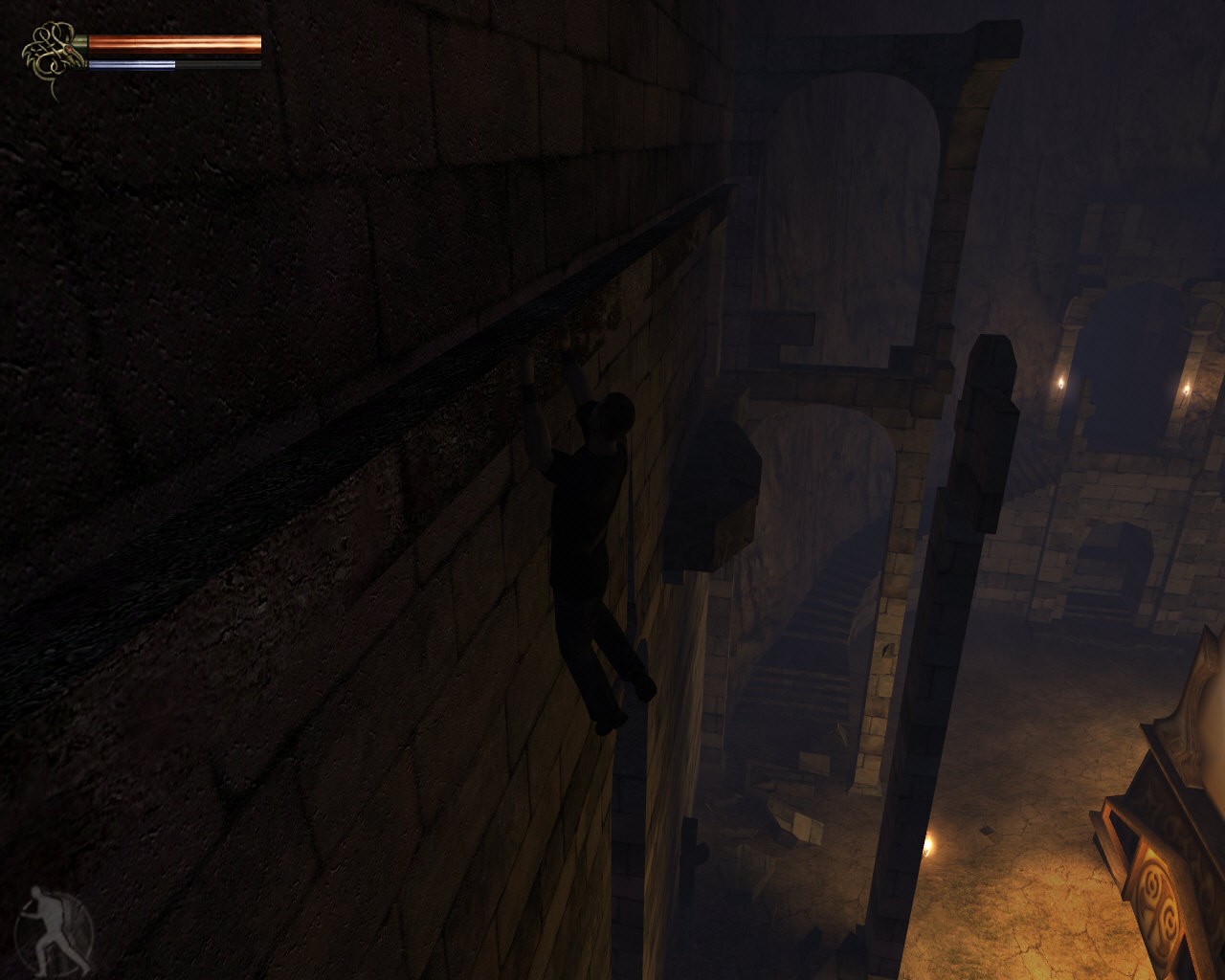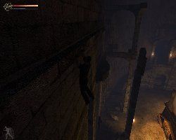 You also have the ability to do long running jumps, grab ledges (and walk with your hands sideways), slide down ziplines, and a few other things. One of the better 'moves' that your guy has is when you walk off a ledge, he will quickly turn around and grab it thus saving himself from horrible death. If you happen to be holding the sword at the time, he will sheath it lighting fast before grabbing the ledge. Too bad he can't swing it at the bad guys that quick. :(