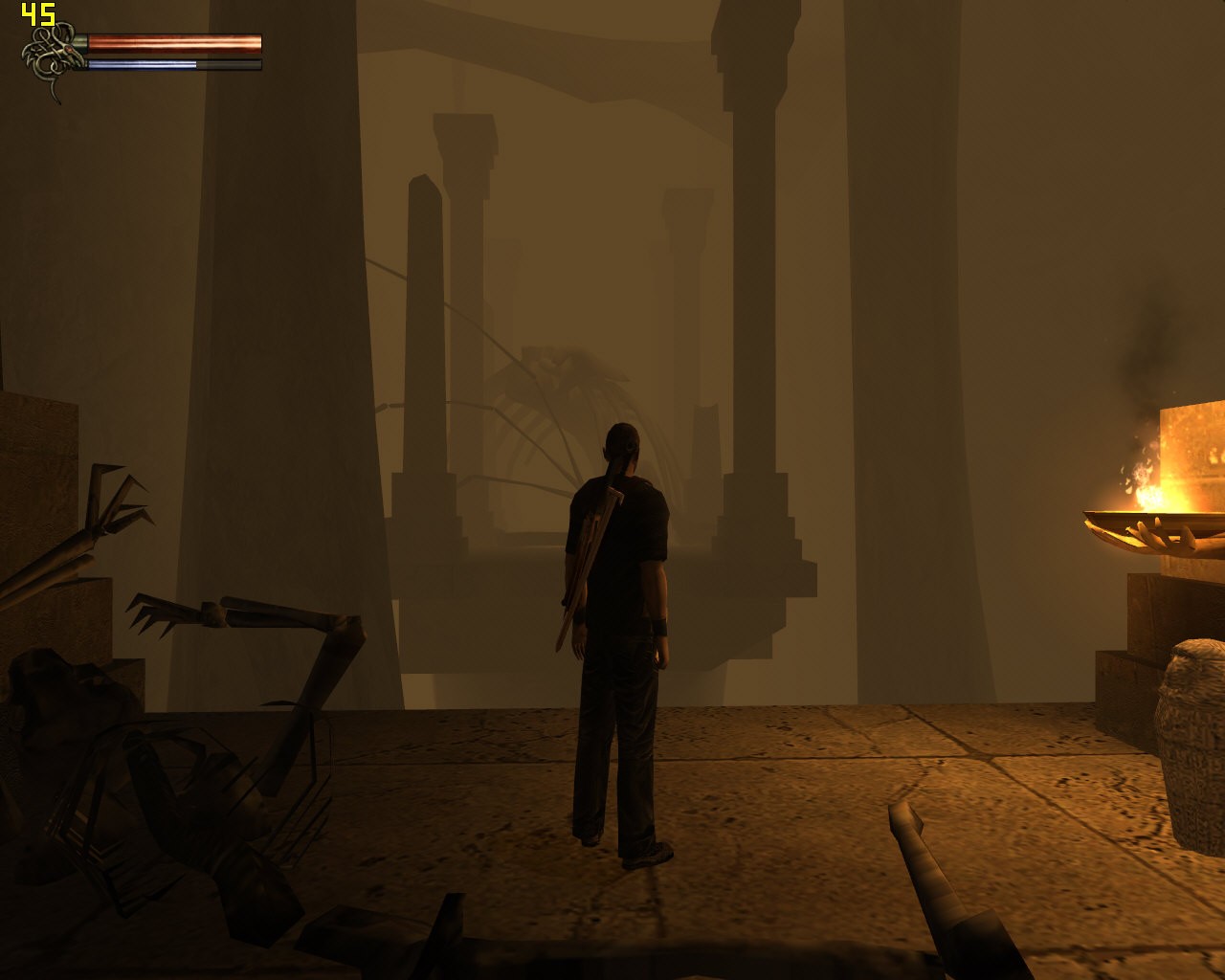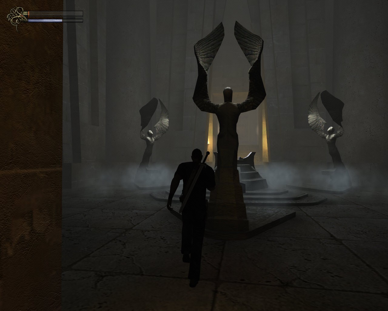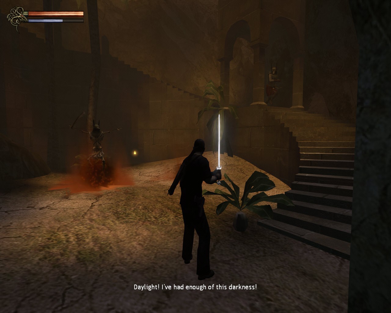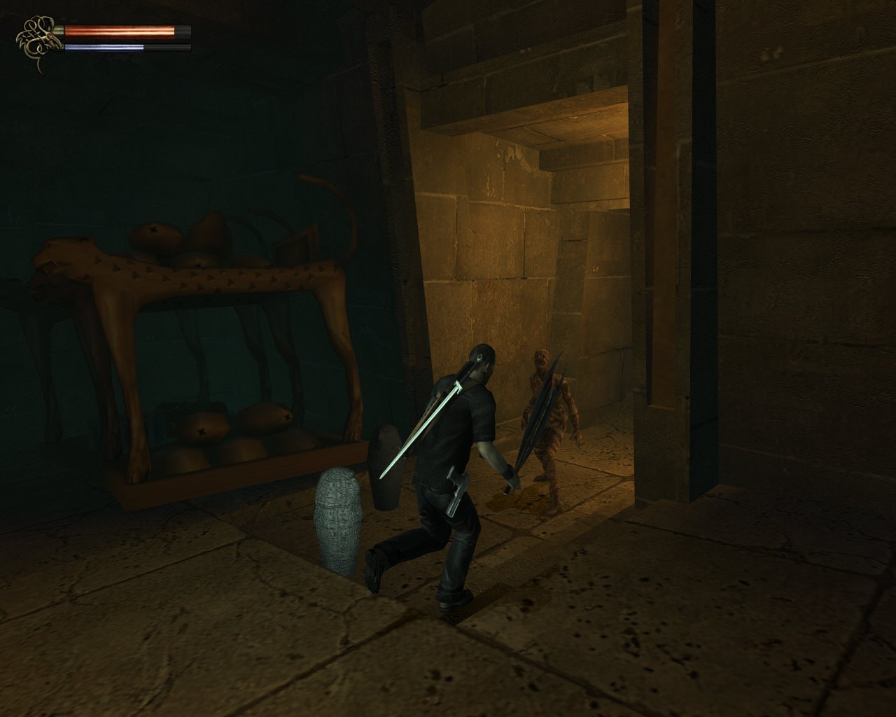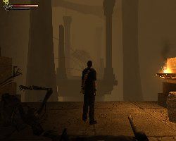 The voice acting, unfortunately.. is nothing short of horrible. The dialogue between the main character and the angel that follows him around is best Esc'd out of as soon as it starts. The main character's voice makes him sound like he should be named something like "Snake Logan".. I guess he talks a little like Clint Eastwood. And then there's the one-liners where he mouths off to the angel or talks to himself while exploring tombs. One comment he made, "I need an insecticide, not a sword" when climbing down into a room full of beetlebugs made me smile.. but most of the other one-liners kept me from smiling at anything for hours (they weren't funny at all). One of the best examples of the bad voice acting is towards the end of the game when he screams/hisses "Where...........IS........MY..........BROTHER??!!" into the pitch black sky. If you've gotten to that point, and have the US version of the game you'll surely know what I'm talking about.