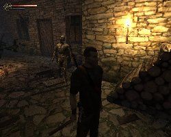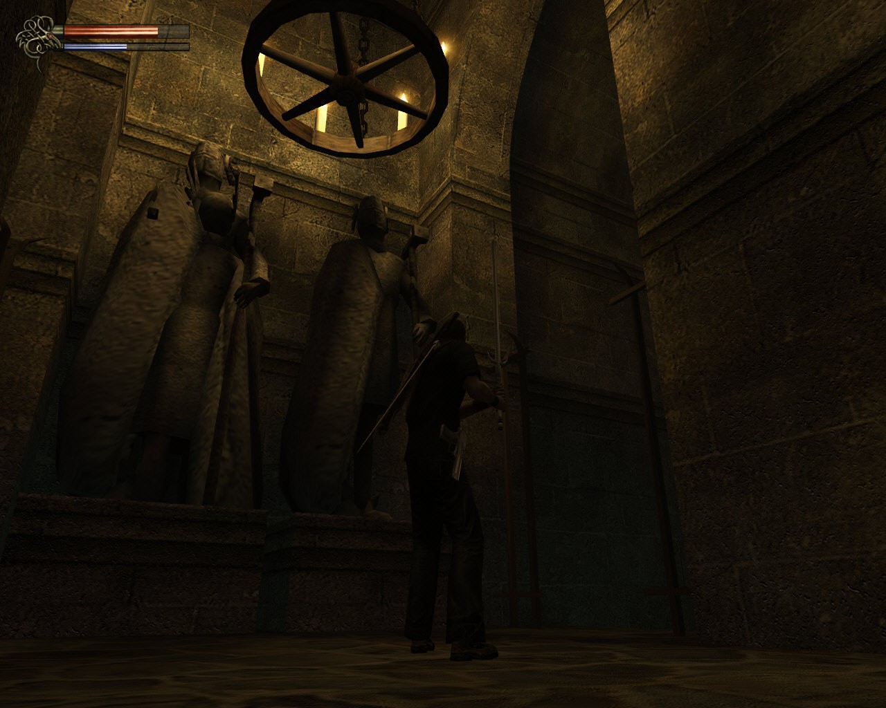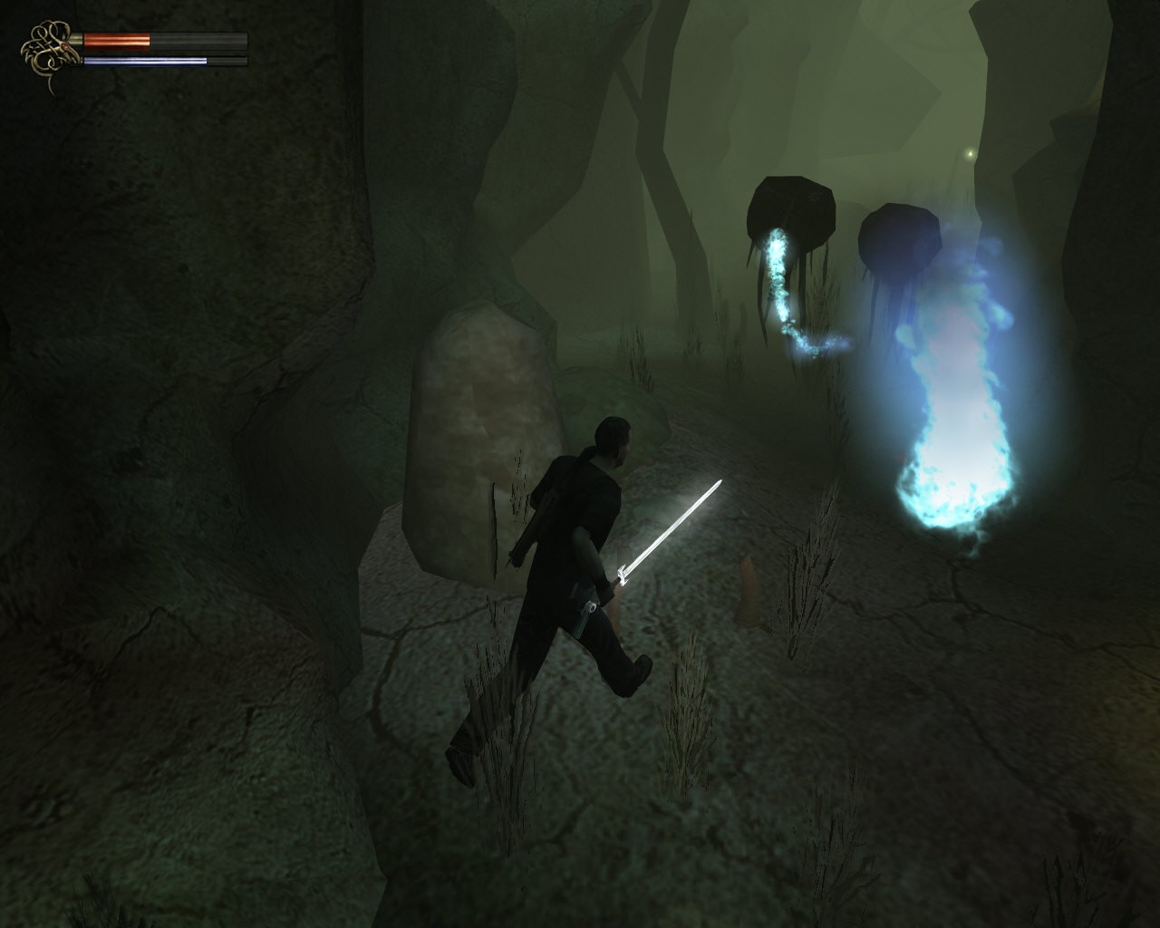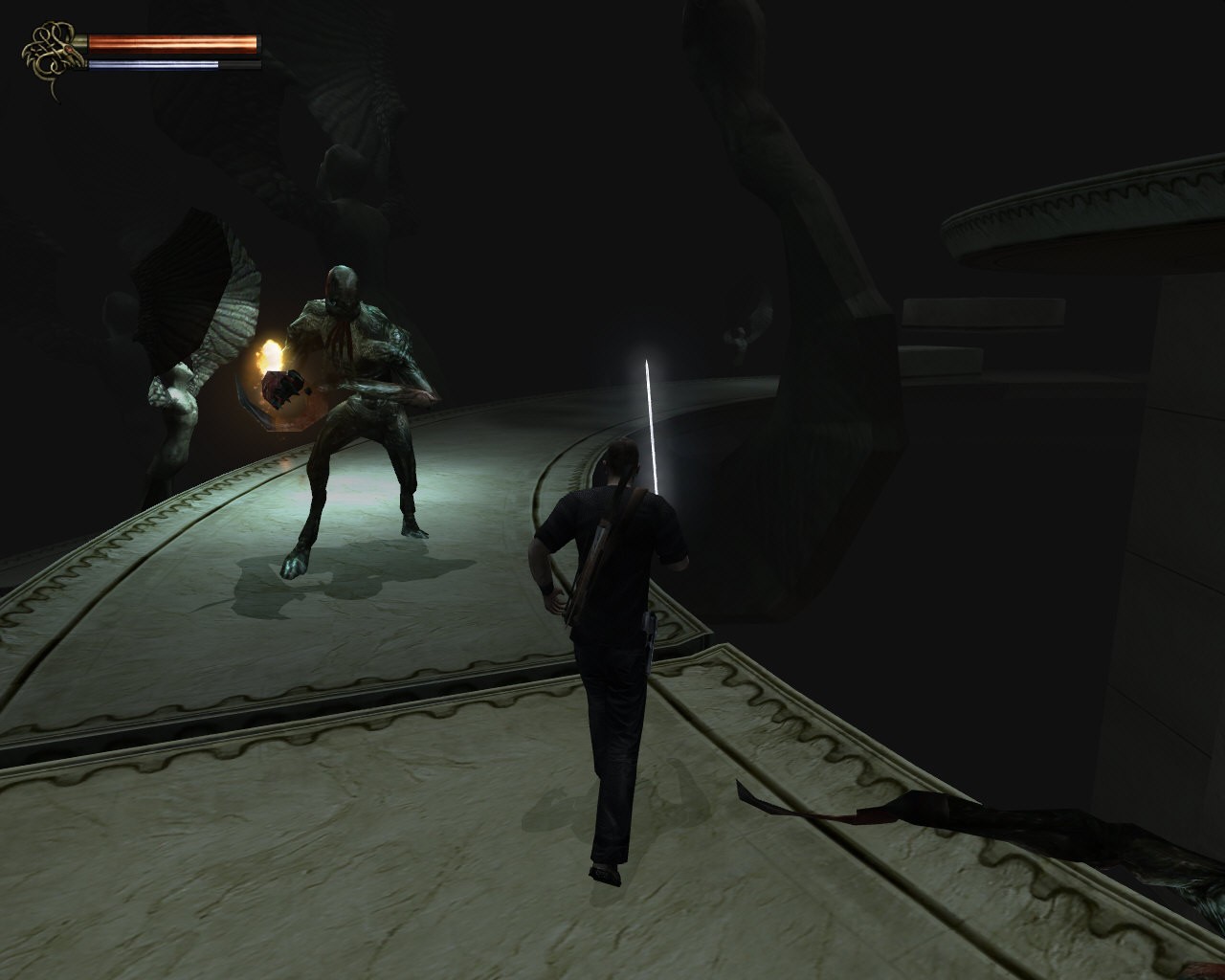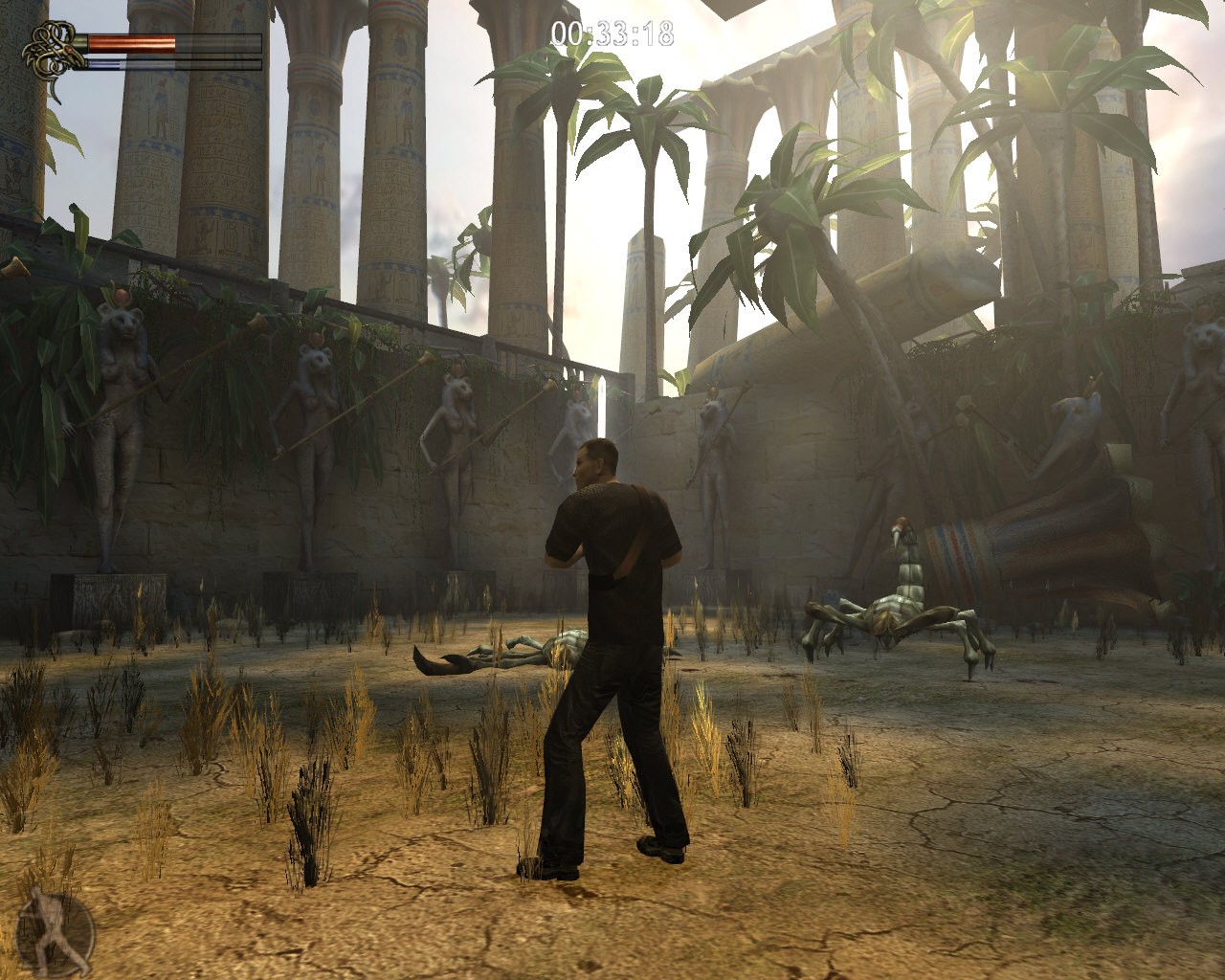 The voice acting, unfortunately.. is nothing short of horrible. The dialogue between the main character and the angel that follows him around is best Esc'd out of as soon as it starts. The main character's voice makes him sound like he should be named something like "Snake Logan".. I guess he talks a little like Clint Eastwood. And then there's the one-liners where he mouths off to the angel or talks to himself while exploring tombs. One comment he made, "I need an insecticide, not a sword" when climbing down into a room full of beetlebugs made me smile.. but most of the other one-liners kept me from smiling at anything for hours (they weren't funny at all). One of the best examples of the bad voice acting is towards the end of the game when he screams/hisses "Where...........IS........MY..........BROTHER??!!" into the pitch black sky. If you've gotten to that point, and have the US version of the game you'll surely know what I'm talking about.