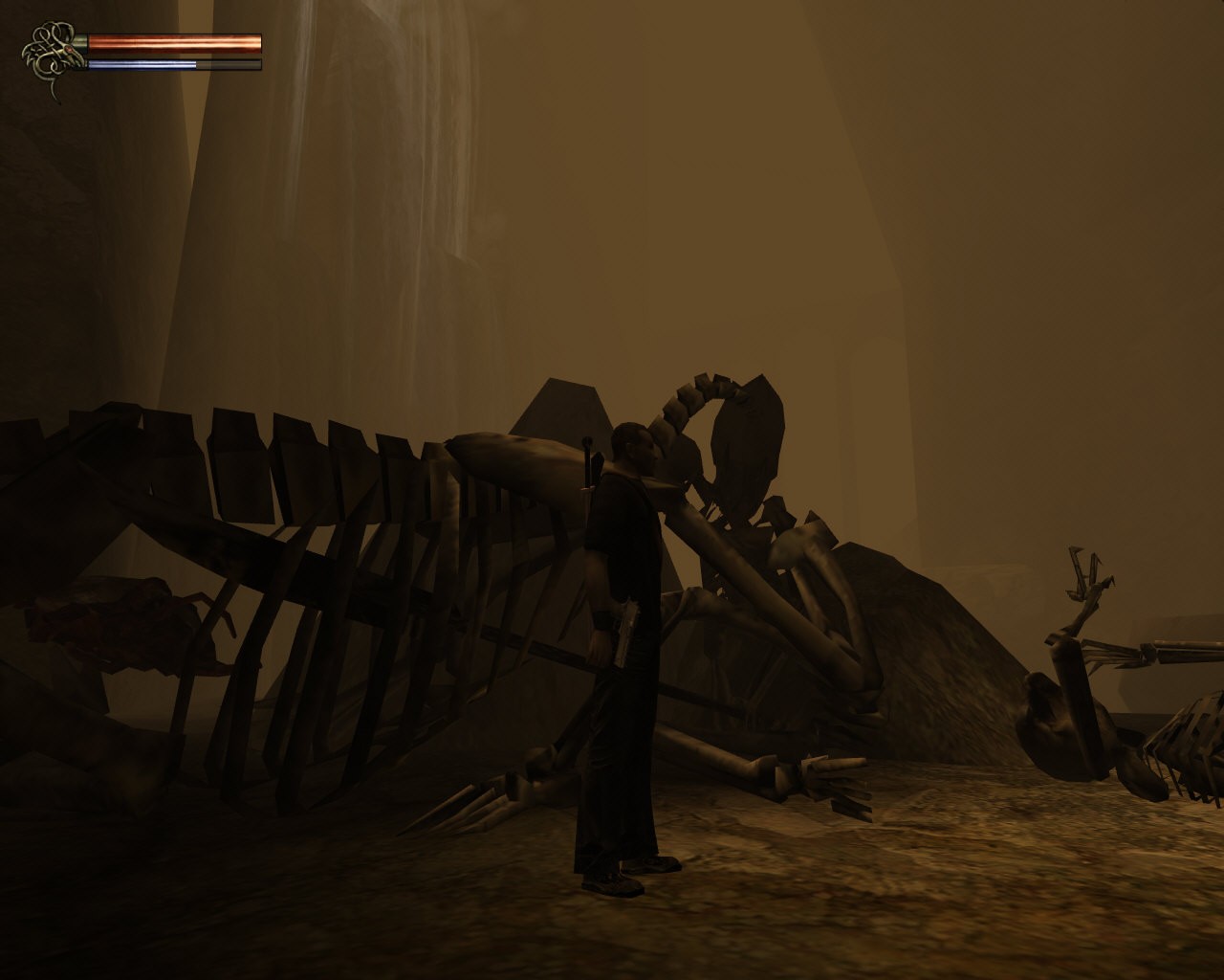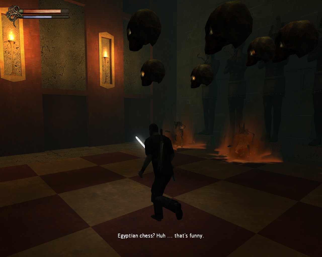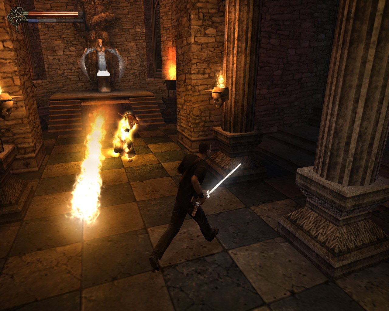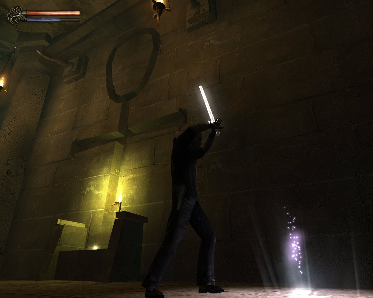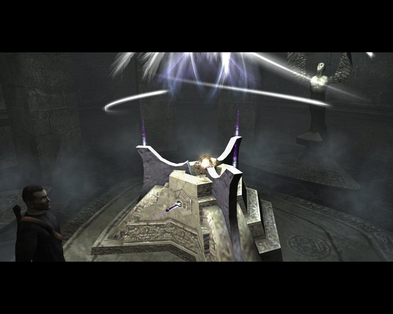 The voice acting, unfortunately.. is nothing short of horrible. The dialogue between the main character and the angel that follows him around is best Esc'd out of as soon as it starts. The main character's voice makes him sound like he should be named something like "Snake Logan".. I guess he talks a little like Clint Eastwood. And then there's the one-liners where he mouths off to the angel or talks to himself while exploring tombs. One comment he made, "I need an insecticide, not a sword" when climbing down into a room full of beetlebugs made me smile.. but most of the other one-liners kept me from smiling at anything for hours (they weren't funny at all). One of the best examples of the bad voice acting is towards the end of the game when he screams/hisses "Where...........IS........MY..........BROTHER??!!" into the pitch black sky. If you've gotten to that point, and have the US version of the game you'll surely know what I'm talking about.