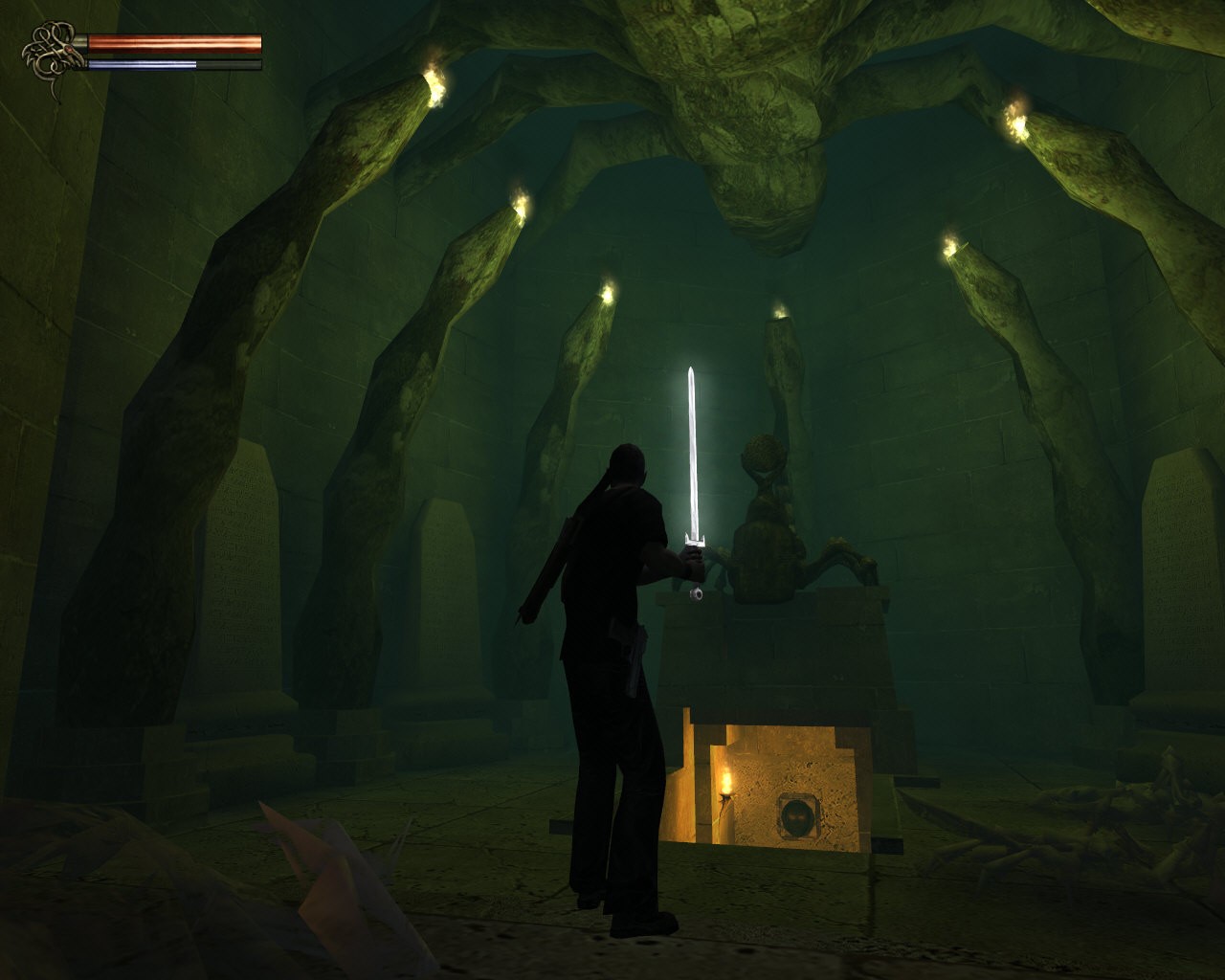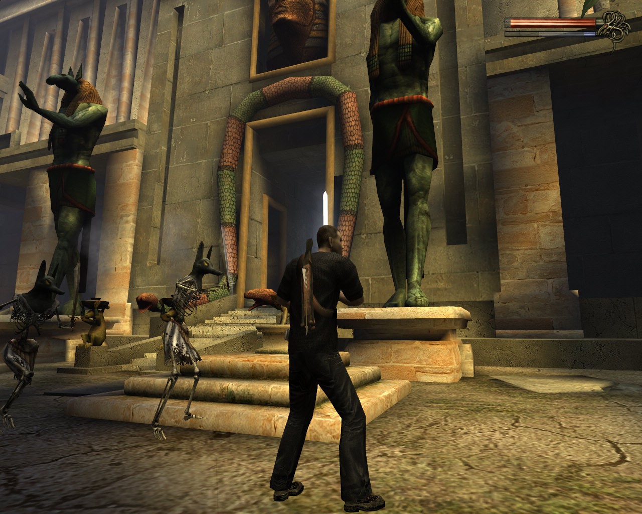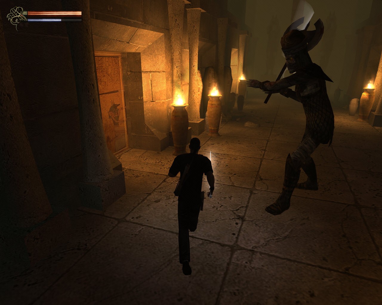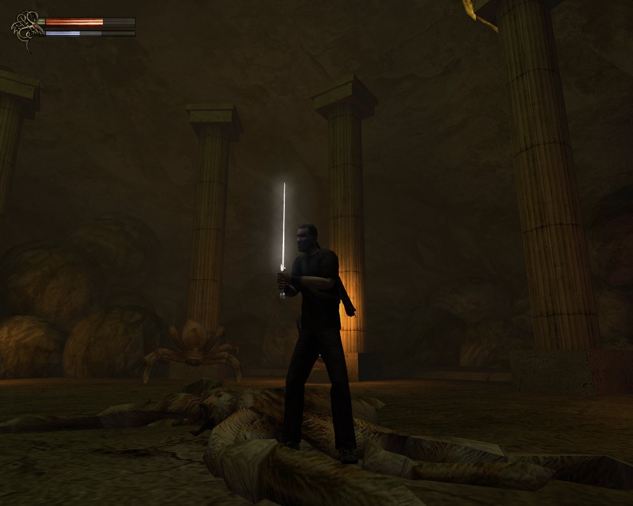 The voice acting, unfortunately.. is nothing short of horrible. The dialogue between the main character and the angel that follows him around is best Esc'd out of as soon as it starts. The main character's voice makes him sound like he should be named something like "Snake Logan".. I guess he talks a little like Clint Eastwood. And then there's the one-liners where he mouths off to the angel or talks to himself while exploring tombs. One comment he made, "I need an insecticide, not a sword" when climbing down into a room full of beetlebugs made me smile.. but most of the other one-liners kept me from smiling at anything for hours (they weren't funny at all). One of the best examples of the bad voice acting is towards the end of the game when he screams/hisses "Where...........IS........MY..........BROTHER??!!" into the pitch black sky. If you've gotten to that point, and have the US version of the game you'll surely know what I'm talking about.
