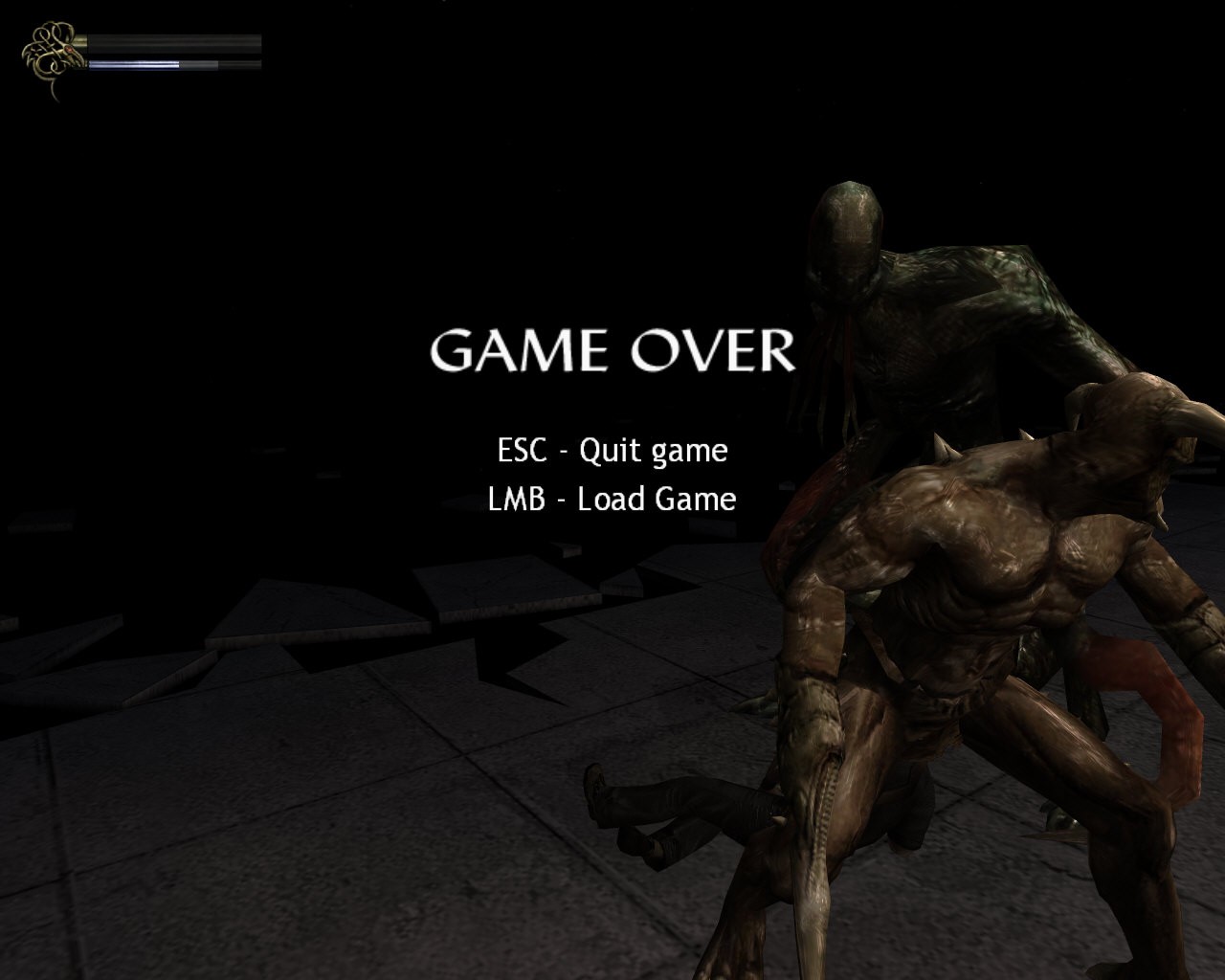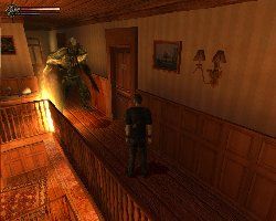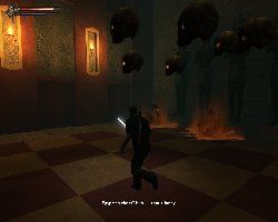 At first you are armed only with a pistol, but later get a neat glowing white sword (similar to the sword of Ianna in Blade) and the ability to morph into a demon. You can also pick up any enemy dropped weapon (like Blade), but unfortunately you cannot stock it in your inventory. If you climb a ladder or rope you must drop it. With the touch of a button you can morph into a demon. The effects during this transition are impressive (movie, 1 meg) and while in demon form, with your talon arms you can really knock the hell out of some zombies... You are invincible (but any damage taken will reduce your time as a demon) and your strength is devastating.