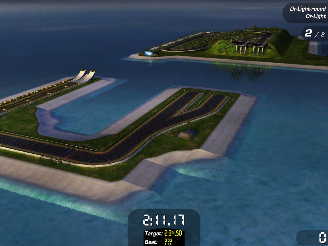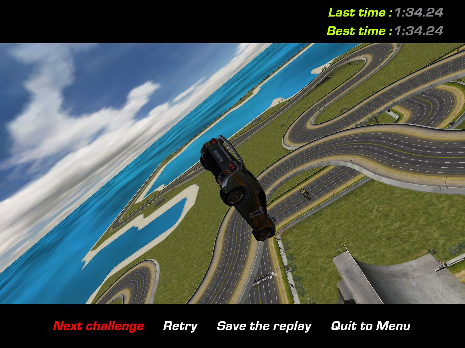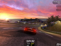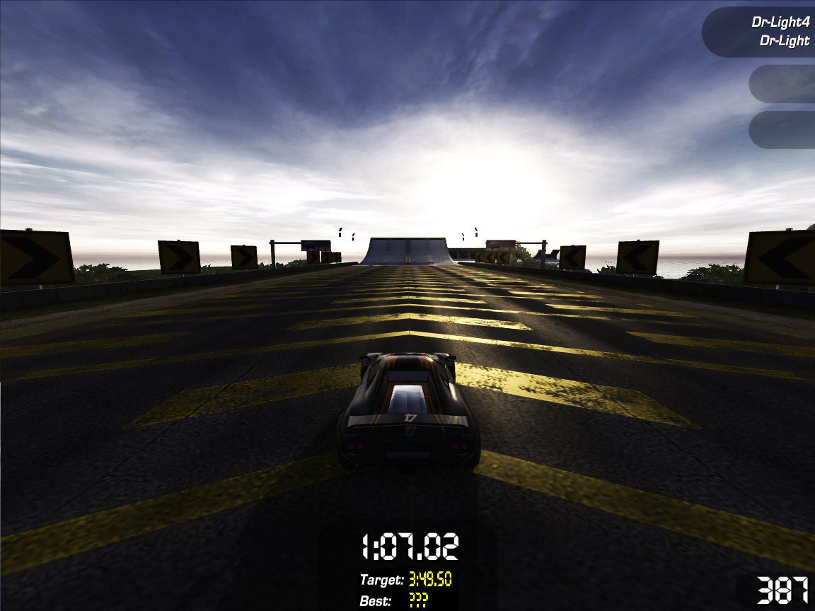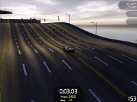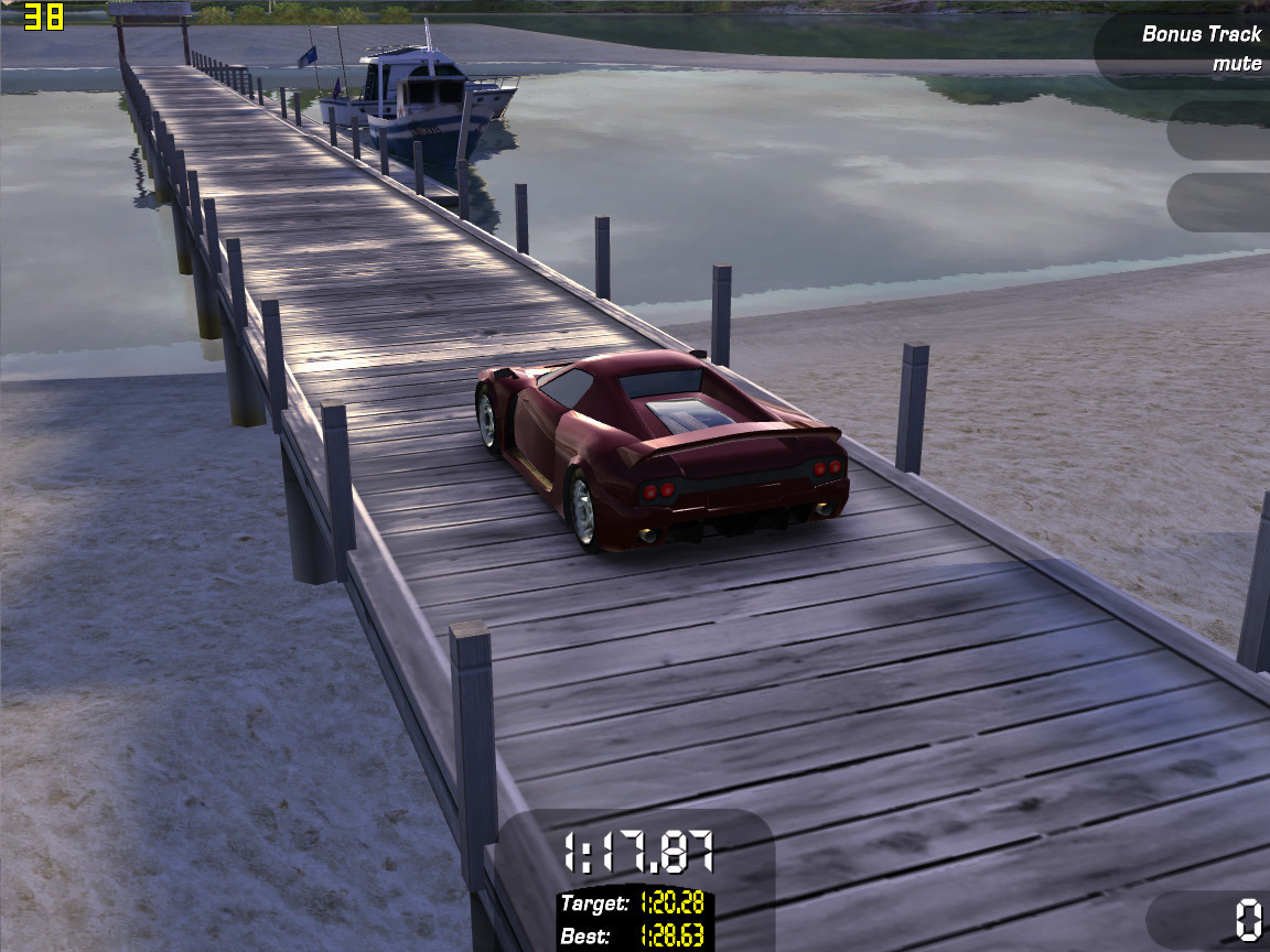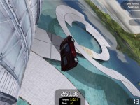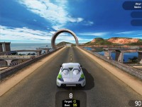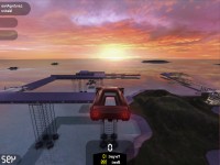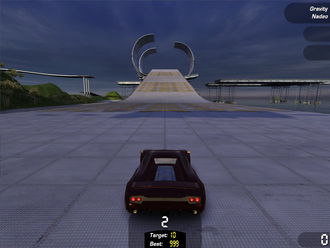 There's Bay, Island, and Coast environments. I'm not sure which one corresponds with which but I'll describe the differences anyway. One is an SUV-style vehicle that looks mysteriously like the newest Land Rover. It has a quick start-up and handles extraordinarily well. It doesn't matter how you crash or land or crashland, you'll have a 90% chance of ending up on your wheels (if only all SUVs can be like that). The top speed is fairly low but the tracks that correspond to it generally have really tight turns and lots of small jumps. Another environment requires a muscle car of some sort. This one is kind of silly because the car is very slow and handles very poorly AND has a very low top speed. However, this environment is by far the best looking in my opinion (yet it's the one that I have the least screenshots of.. Go figure). Learning how to maneuver the car can take a bit of practice. Once you have it down the tracks are either very easy (simple turns, simple jumps) or very frustrating (holes in the middle of the road, objects in the middle of the road, medium jumps right after a curve that you have to take perfectly to make the jump). Finally you have the race car environment... By far the most fun out of the three (in my opinion). Here you have a car that handles pretty good and goes really really really fast. The tracks associated with it are usually wide and are the most fun as long as they aren't confusing. There are some tracks though where you'll have a ramp that shoots you straight up into the air, and you'll have to land on another ramp ~500 feet to the left or right. Sometimes you don't know exactly where that other ramp is and 90% of the time you don't know exactly how far away it is. Therefore it can take you 5,10,20 tries to make the jump the first time (there can be some REALLY difficult jumps) and another 10 times to perfect it. I prefer the tracks without these types of jumps, or if they do have them... they have a large margin of error for your landing.
