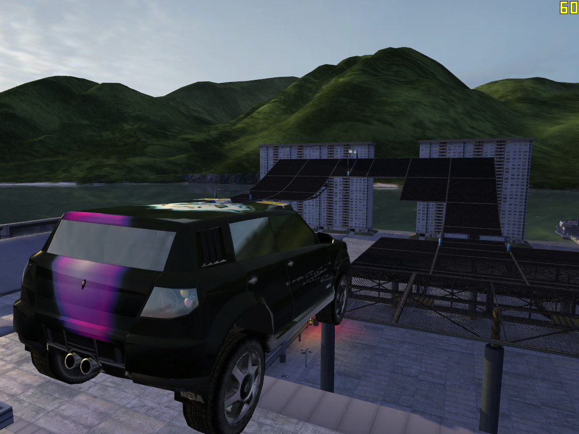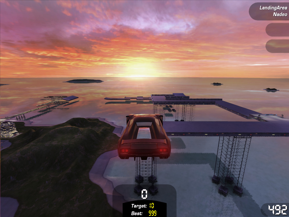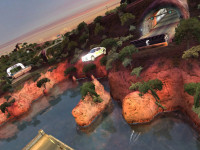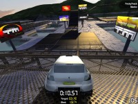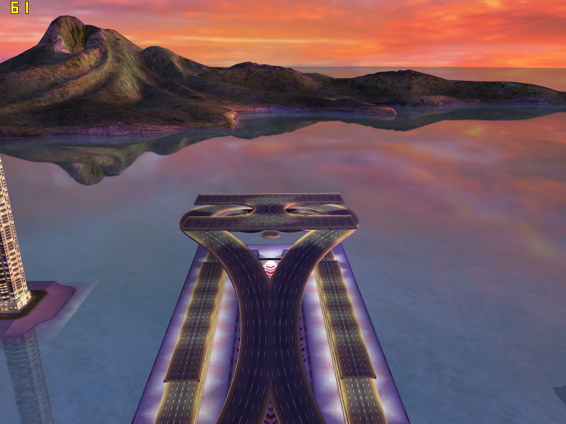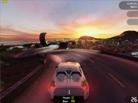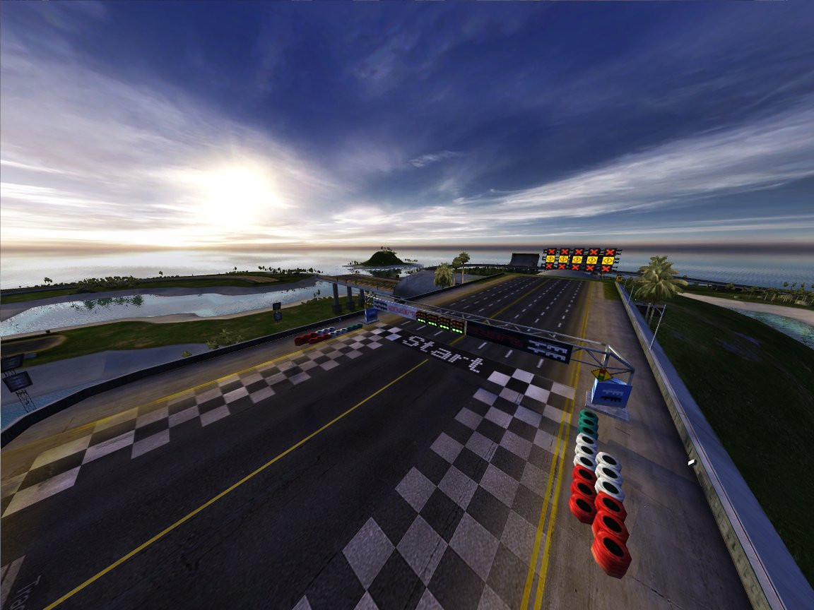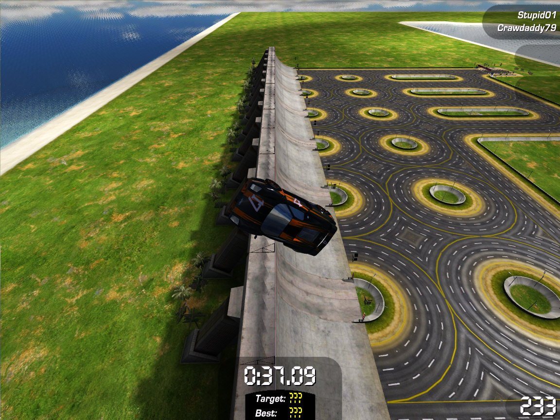 There's Bay, Island, and Coast environments. I'm not sure which one corresponds with which but I'll describe the differences anyway. One is an SUV-style vehicle that looks mysteriously like the newest Land Rover. It has a quick start-up and handles extraordinarily well. It doesn't matter how you crash or land or crashland, you'll have a 90% chance of ending up on your wheels (if only all SUVs can be like that). The top speed is fairly low but the tracks that correspond to it generally have really tight turns and lots of small jumps. Another environment requires a muscle car of some sort. This one is kind of silly because the car is very slow and handles very poorly AND has a very low top speed. However, this environment is by far the best looking in my opinion (yet it's the one that I have the least screenshots of.. Go figure). Learning how to maneuver the car can take a bit of practice. Once you have it down the tracks are either very easy (simple turns, simple jumps) or very frustrating (holes in the middle of the road, objects in the middle of the road, medium jumps right after a curve that you have to take perfectly to make the jump). Finally you have the race car environment... By far the most fun out of the three (in my opinion). Here you have a car that handles pretty good and goes really really really fast. The tracks associated with it are usually wide and are the most fun as long as they aren't confusing. There are some tracks though where you'll have a ramp that shoots you straight up into the air, and you'll have to land on another ramp ~500 feet to the left or right. Sometimes you don't know exactly where that other ramp is and 90% of the time you don't know exactly how far away it is. Therefore it can take you 5,10,20 tries to make the jump the first time (there can be some REALLY difficult jumps) and another 10 times to perfect it. I prefer the tracks without these types of jumps, or if they do have them... they have a large margin of error for your landing.