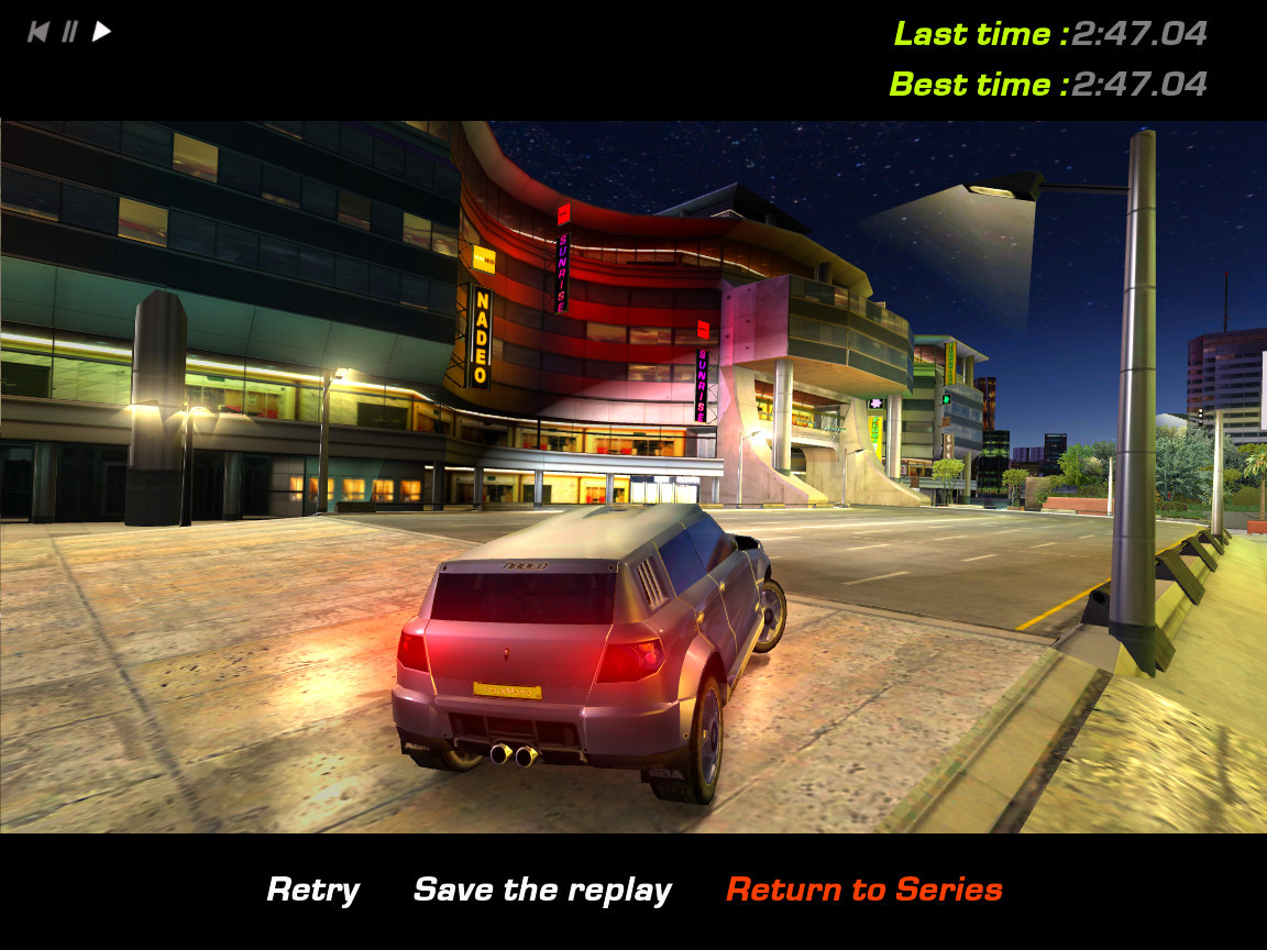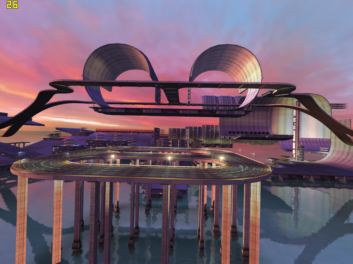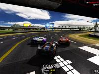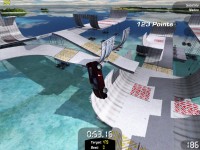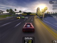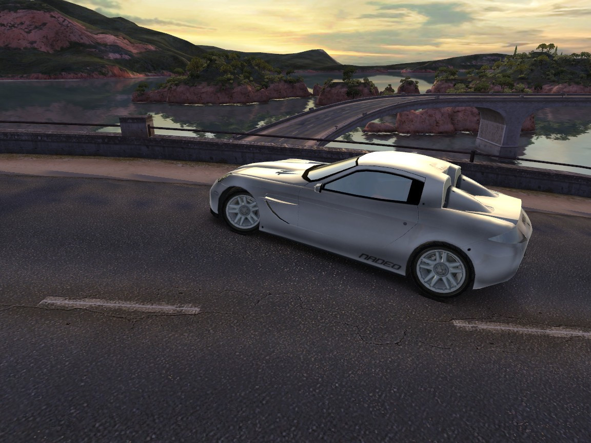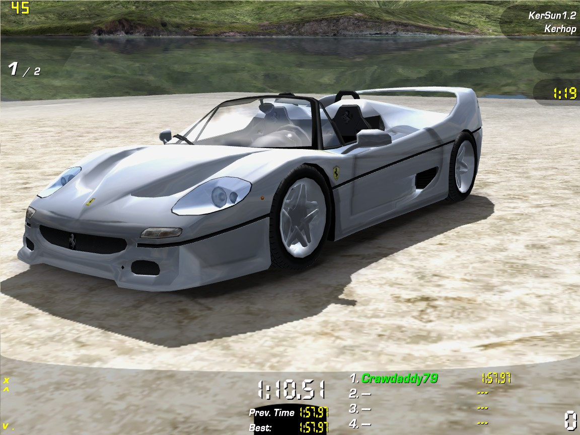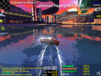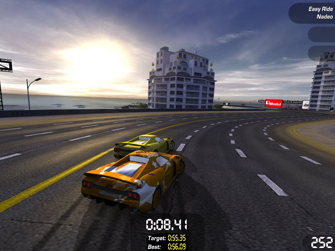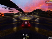 There's Bay, Island, and Coast environments. I'm not sure which one corresponds with which but I'll describe the differences anyway. One is an SUV-style vehicle that looks mysteriously like the newest Land Rover. It has a quick start-up and handles extraordinarily well. It doesn't matter how you crash or land or crashland, you'll have a 90% chance of ending up on your wheels (if only all SUVs can be like that). The top speed is fairly low but the tracks that correspond to it generally have really tight turns and lots of small jumps. Another environment requires a muscle car of some sort. This one is kind of silly because the car is very slow and handles very poorly AND has a very low top speed. However, this environment is by far the best looking in my opinion (yet it's the one that I have the least screenshots of.. Go figure). Learning how to maneuver the car can take a bit of practice. Once you have it down the tracks are either very easy (simple turns, simple jumps) or very frustrating (holes in the middle of the road, objects in the middle of the road, medium jumps right after a curve that you have to take perfectly to make the jump). Finally you have the race car environment... By far the most fun out of the three (in my opinion). Here you have a car that handles pretty good and goes really really really fast. The tracks associated with it are usually wide and are the most fun as long as they aren't confusing. There are some tracks though where you'll have a ramp that shoots you straight up into the air, and you'll have to land on another ramp ~500 feet to the left or right. Sometimes you don't know exactly where that other ramp is and 90% of the time you don't know exactly how far away it is. Therefore it can take you 5,10,20 tries to make the jump the first time (there can be some REALLY difficult jumps) and another 10 times to perfect it. I prefer the tracks without these types of jumps, or if they do have them... they have a large margin of error for your landing.