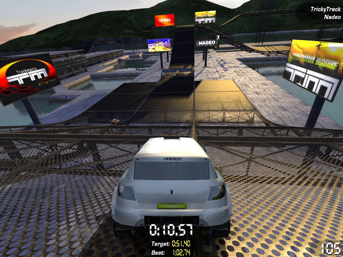 So after reading all of this (you are still here, aren't you?) you still don't know anything about Trackmania: Sunrise (TMS) except for what it looks like. My apologies. TMS is a racing game (obviously) where you will drive your car on various tracks. The faster time you get on the tracks, the better medal you get. The better medal you get, the more coppers you receive. The more coppers you receive, the more extensive and larger tracks you can build. On top of this, when you finish a series you get bonus coppers depending on what your lowest medal is. The more tracks you build, the more you can upload to Trackmania Exchange, where other users will download it and comment on/rate it. You can also set your computer up to be a server that hosts only your tracks and other people can race you on your own turf.