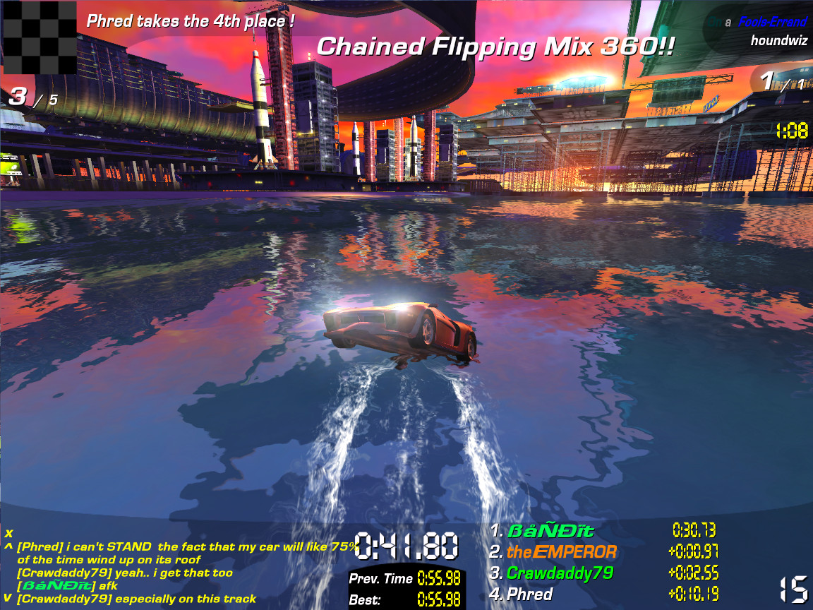 62MB; 2:14Here is a recording from an online race I was playing, and kept crashing. It took me several tries to complete the track. This video shows essentially how frustrating (yet fun!) user-made tracks can be. Here is another recording from an online race. This one I did a little bit better on. I still crashed a lot. It was a pretty fun track all in all.